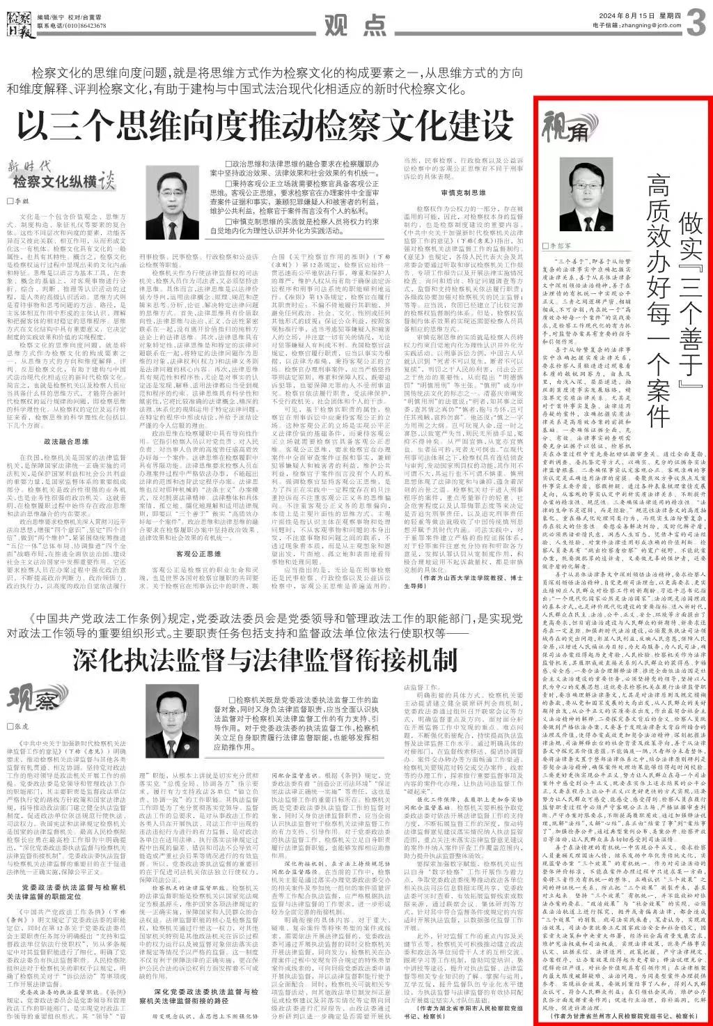 2024年8月15日,检察日报刊发甘肃省兰州市检察院李郁军撰写的文章《做实“三个善于” 高质效办好每一个案件》。