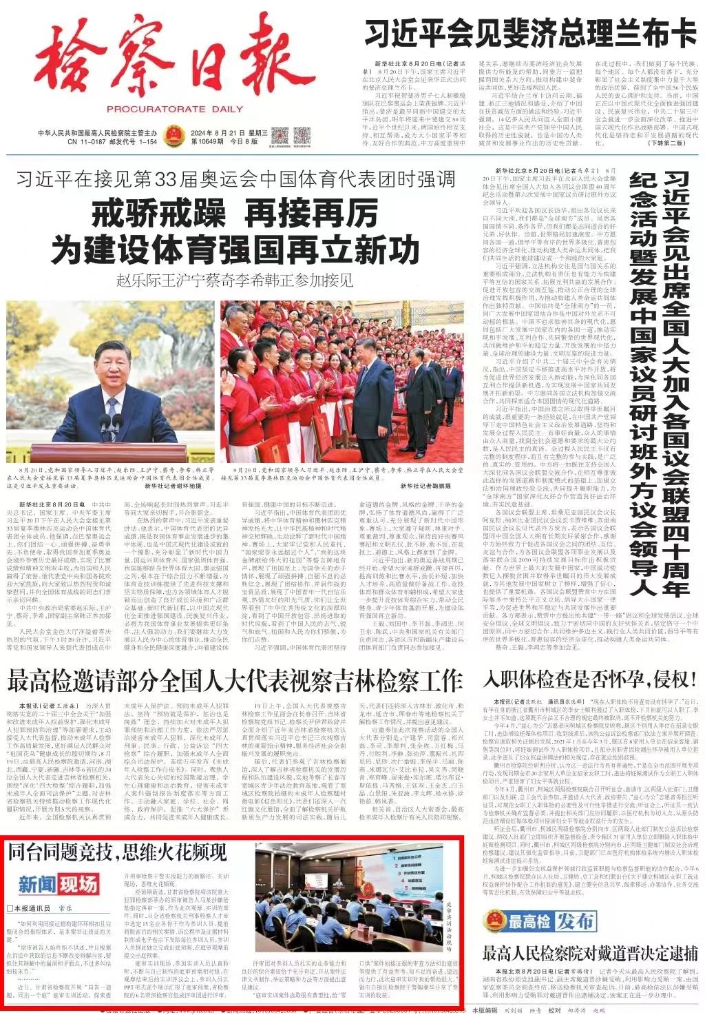 2024年8月21日,检察日报头版刊发《同台同题竞技,思维火花频现》。