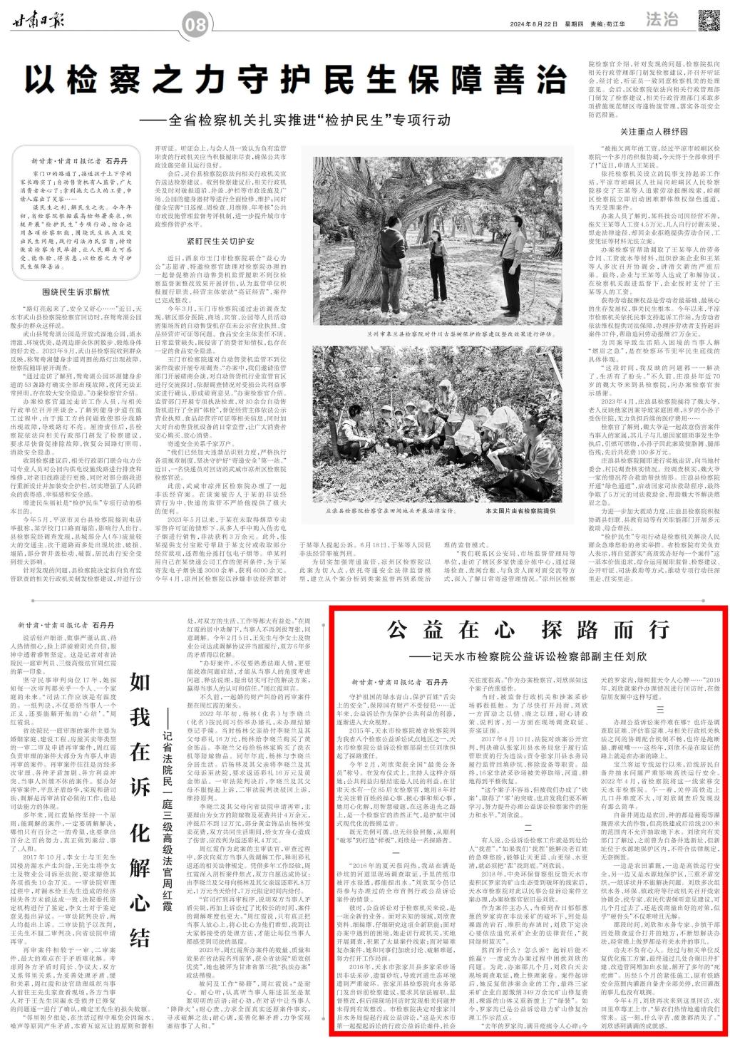 2024年8月22日,甘肃日报刊发《公益在心 探路而行——记天水市检察院公益诉讼检察部副主任刘欣》。