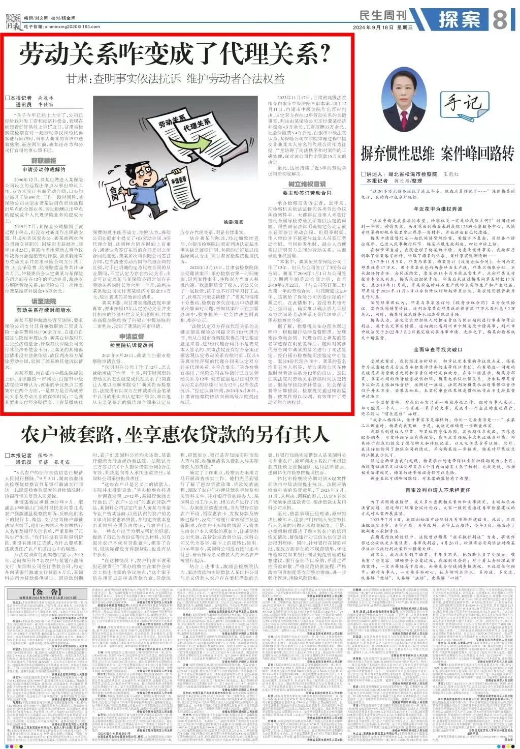 2024年9月18日,检察日报民生周刊刊发《劳动关系咋变成了代理关系?——甘肃:查明事实依法抗诉 维护劳动者合法权益》。