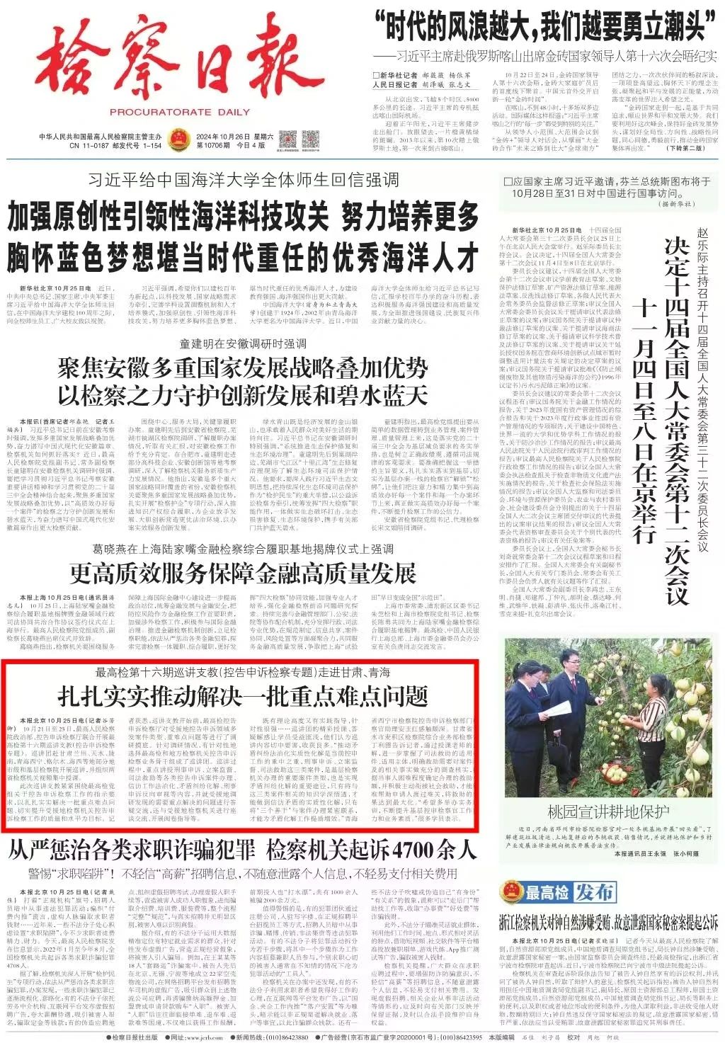 2024年10月26日,检察日报头版刊发《最高检第十六期巡讲支教(控告申诉检察专题)走进甘肃、青海——扎扎实实推动解决一批重点难点问题》。