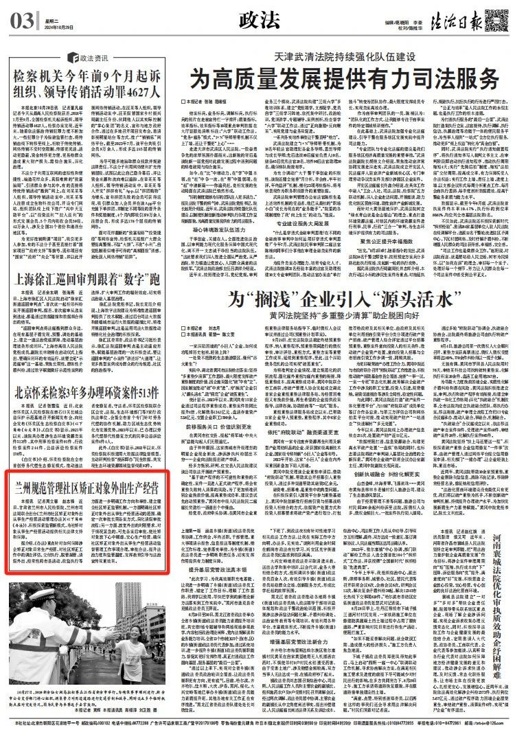 2024年10月29日,法治日报刊发《兰州规范管理社区矫正对象外出生产经营》。