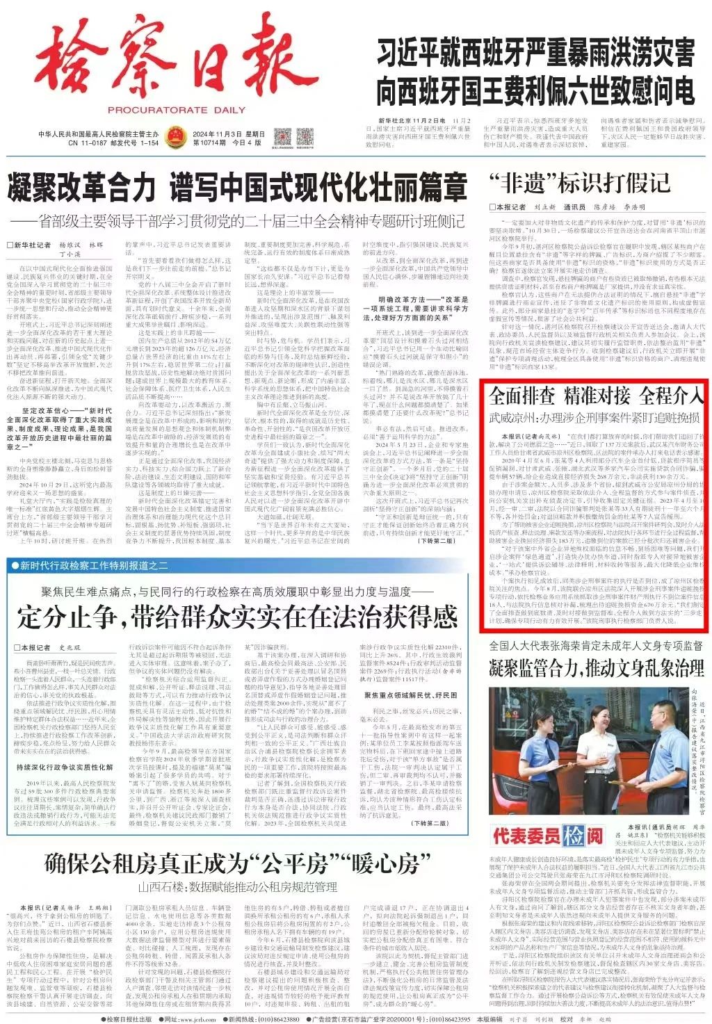 2024年11月3日,检察日报头版刊发《全面排查 精准对接 全程介入——武威凉州:办理涉企刑事案件紧盯追赃挽损》。
