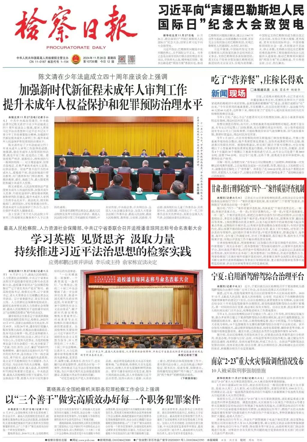 2024年11月28日,检察日报头版刊发《甘肃:推行刑事检察“四个一”案件质量评查机制》。