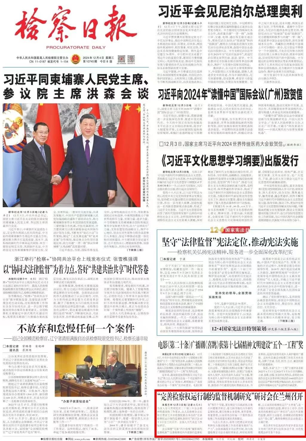 2024年12月4日,检察日报头版刊发《“完善检察权运行制约监督机制研究”研讨会在兰州召开》。