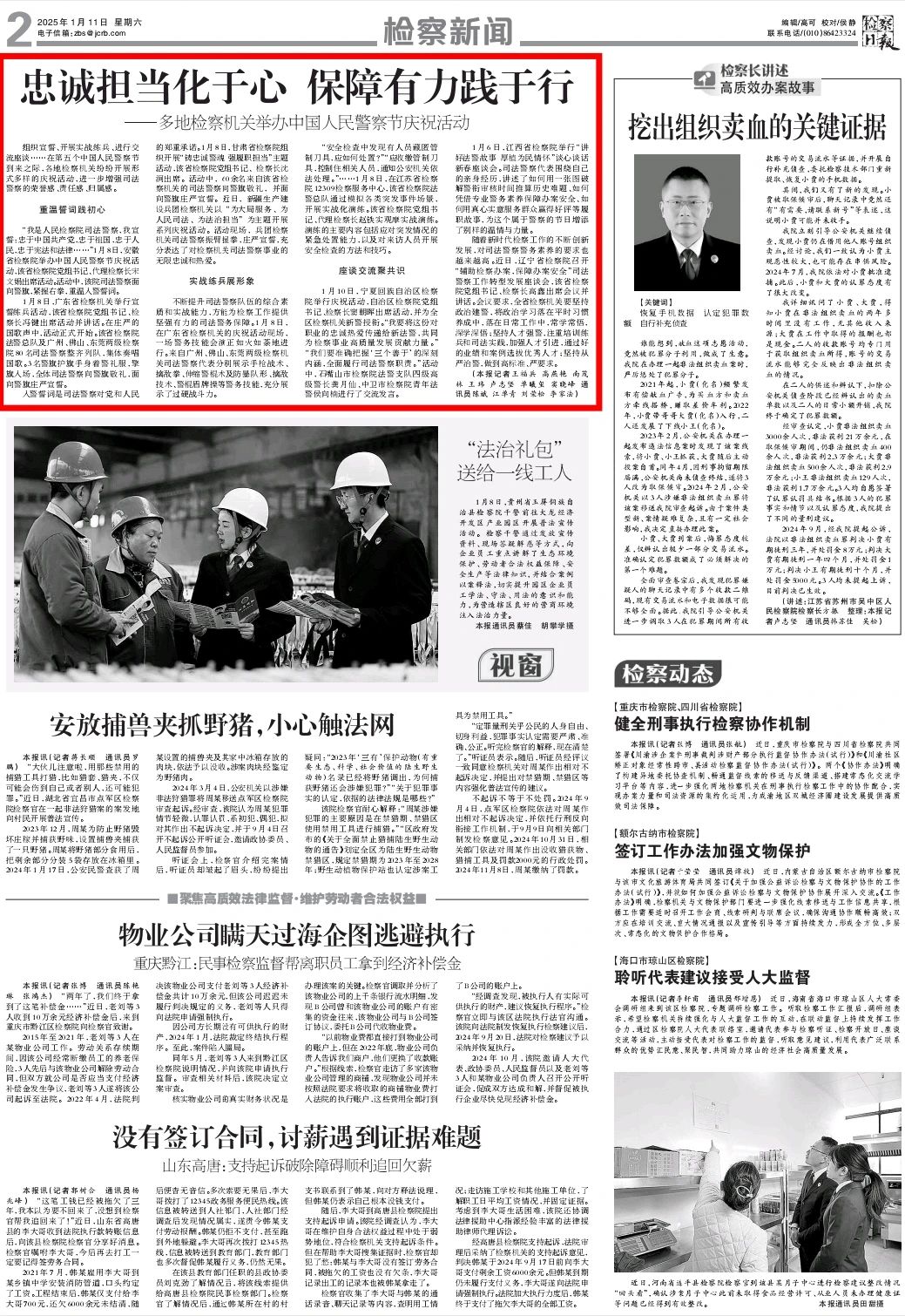 2025年1月11日,检察日报二版头条刊发《忠诚担当化于心 保障有力践于行——多地检察机关举办中国人民警察节庆祝活动》。