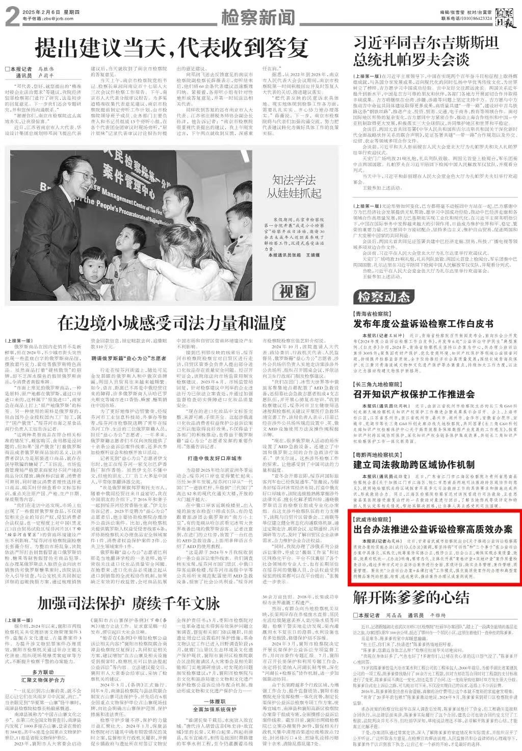 2025年2月6日,检察日报刊发《武威市检察院:出台办法推进公益诉讼检察高质效办案》。