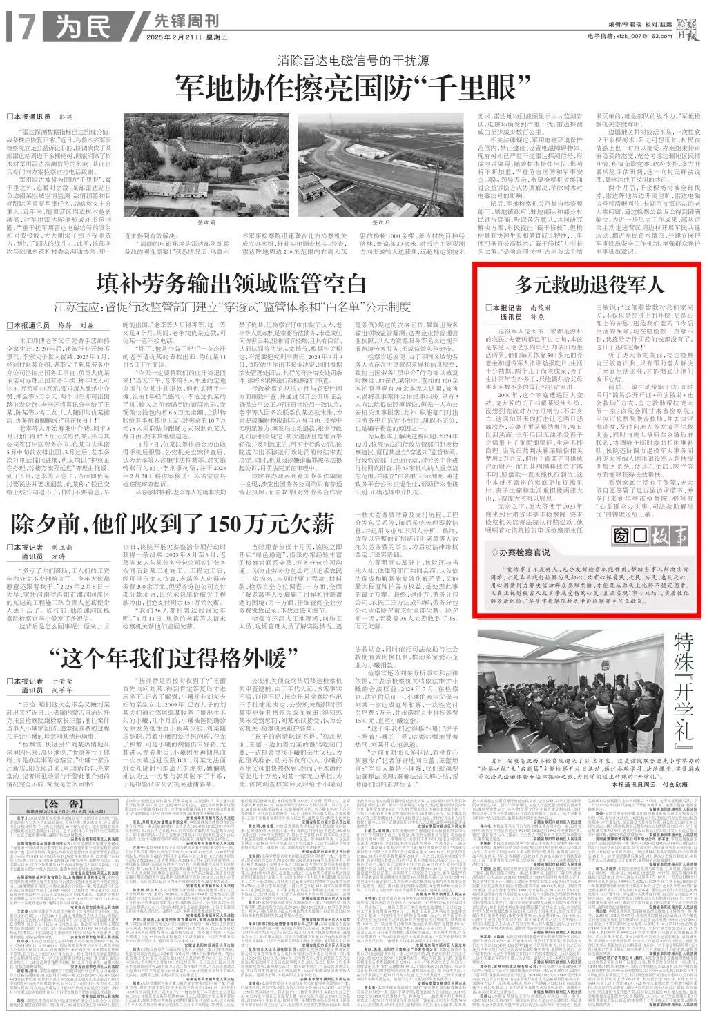 2025年2月21日,检察日报先锋周刊刊发《多元救助退役军人》。