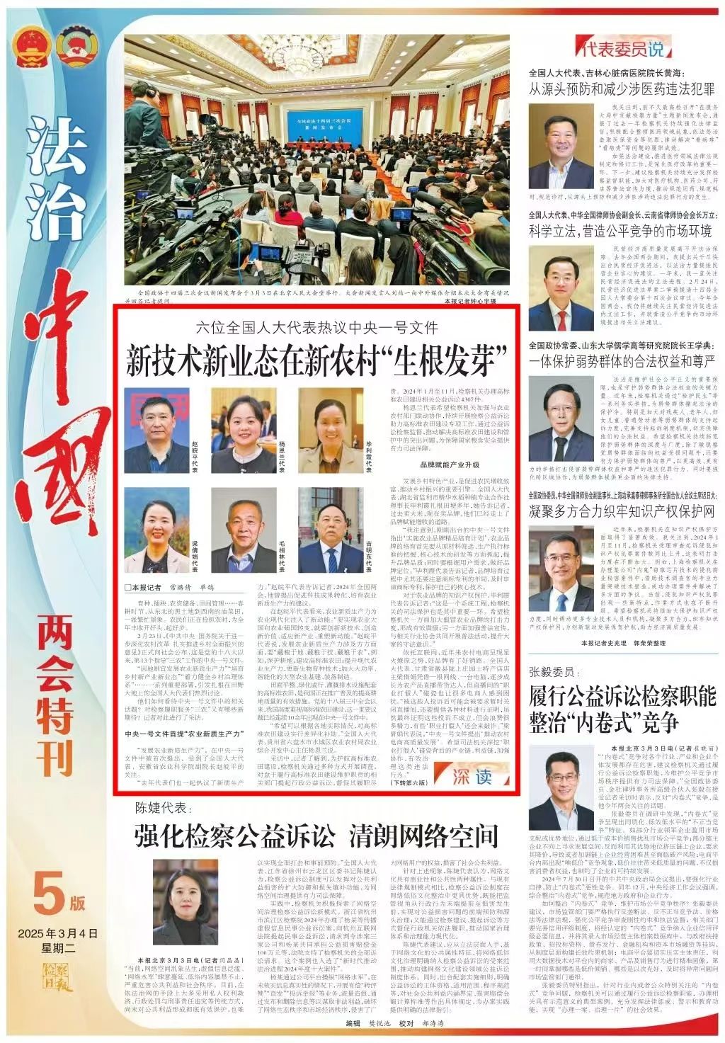 2025年3月4日,检察日报《法治中国两会特刊》专栏刊发《六位全国人大代表热议中央一号文件:新技术新业态在新农村“生根发芽”》。