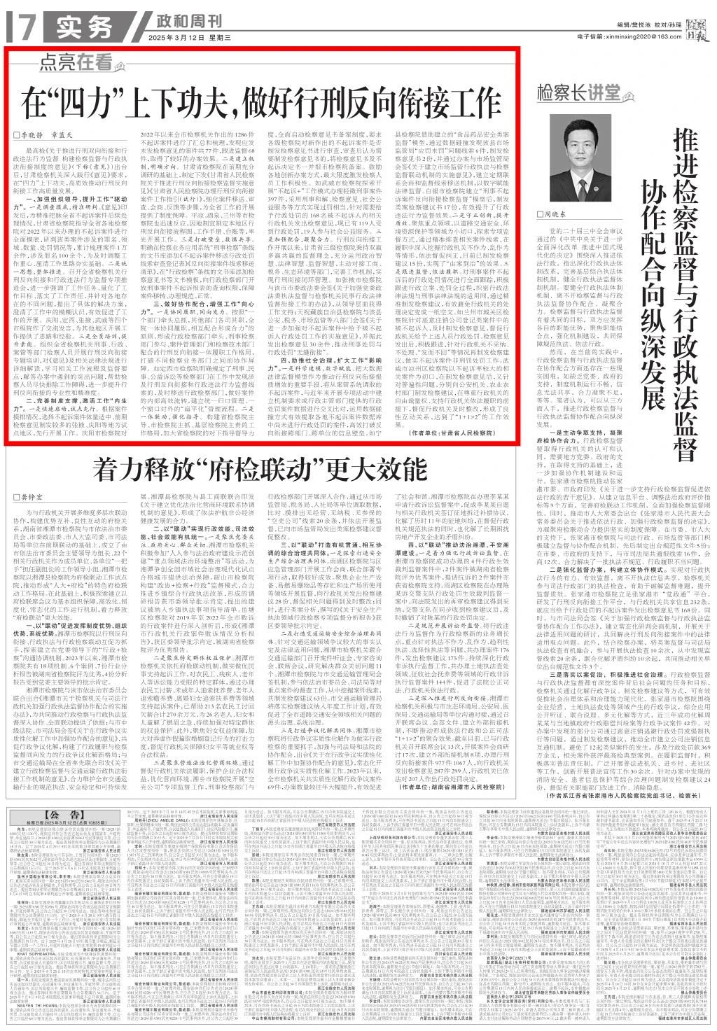 2025年3月12日,检察日报政和周刊刊发《在“四力”上下功夫,做好行刑反向衔接工作》。