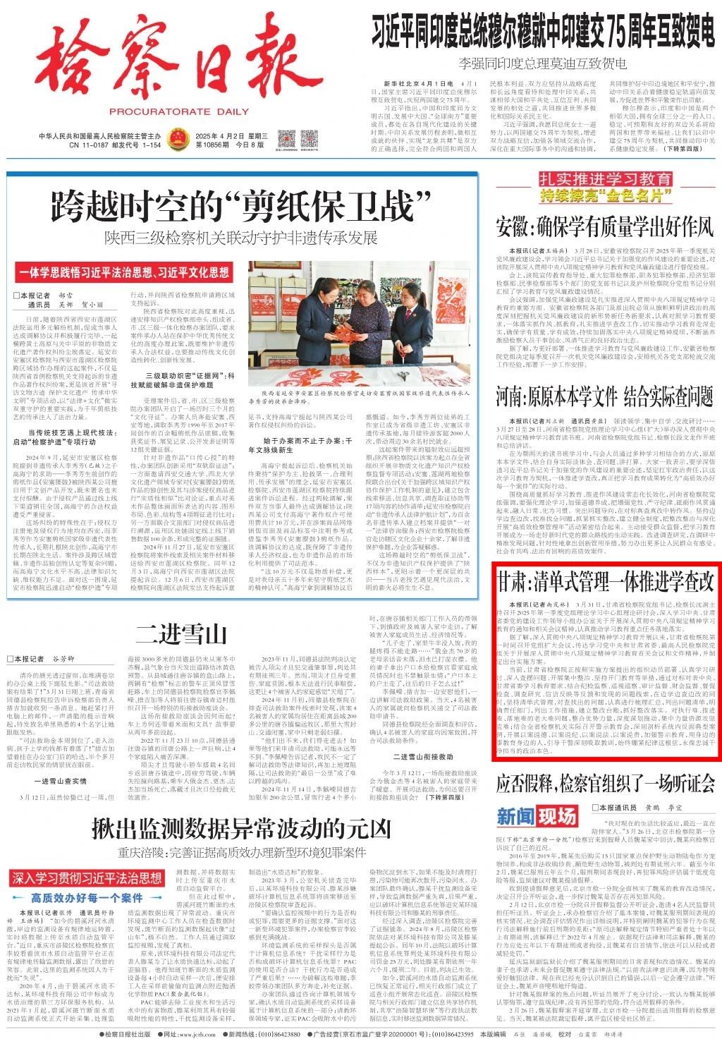 2025年4月2日,检察日报头版刊发《甘肃:清单式管理一体推进学查改》。