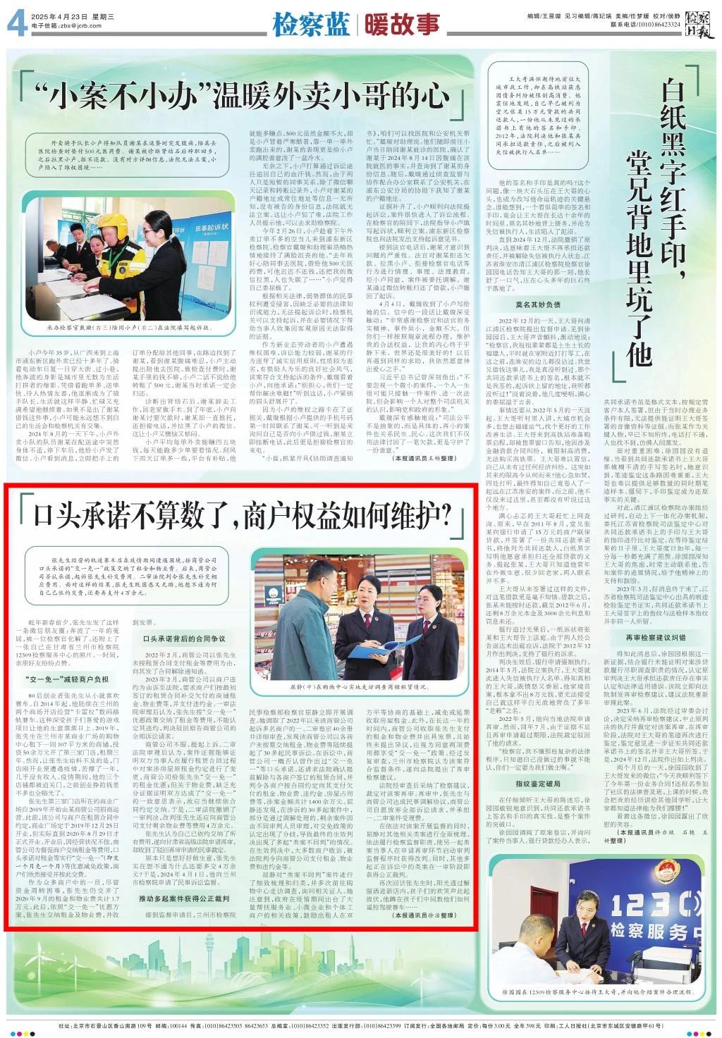 2025年4月23日,检察日报刊发《口头承诺不算数了,商户权益如何维护?》。