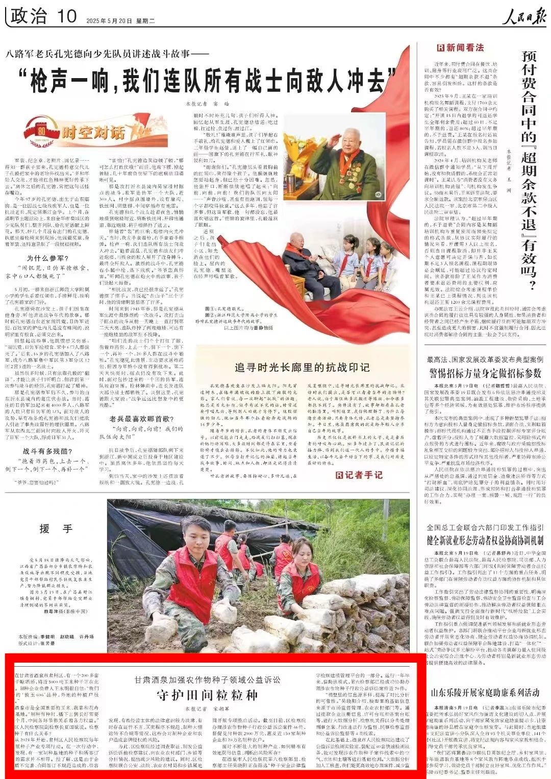 2025年5月20日,人民日报刊发《甘肃酒泉加强农作物种子领域公益诉讼》。