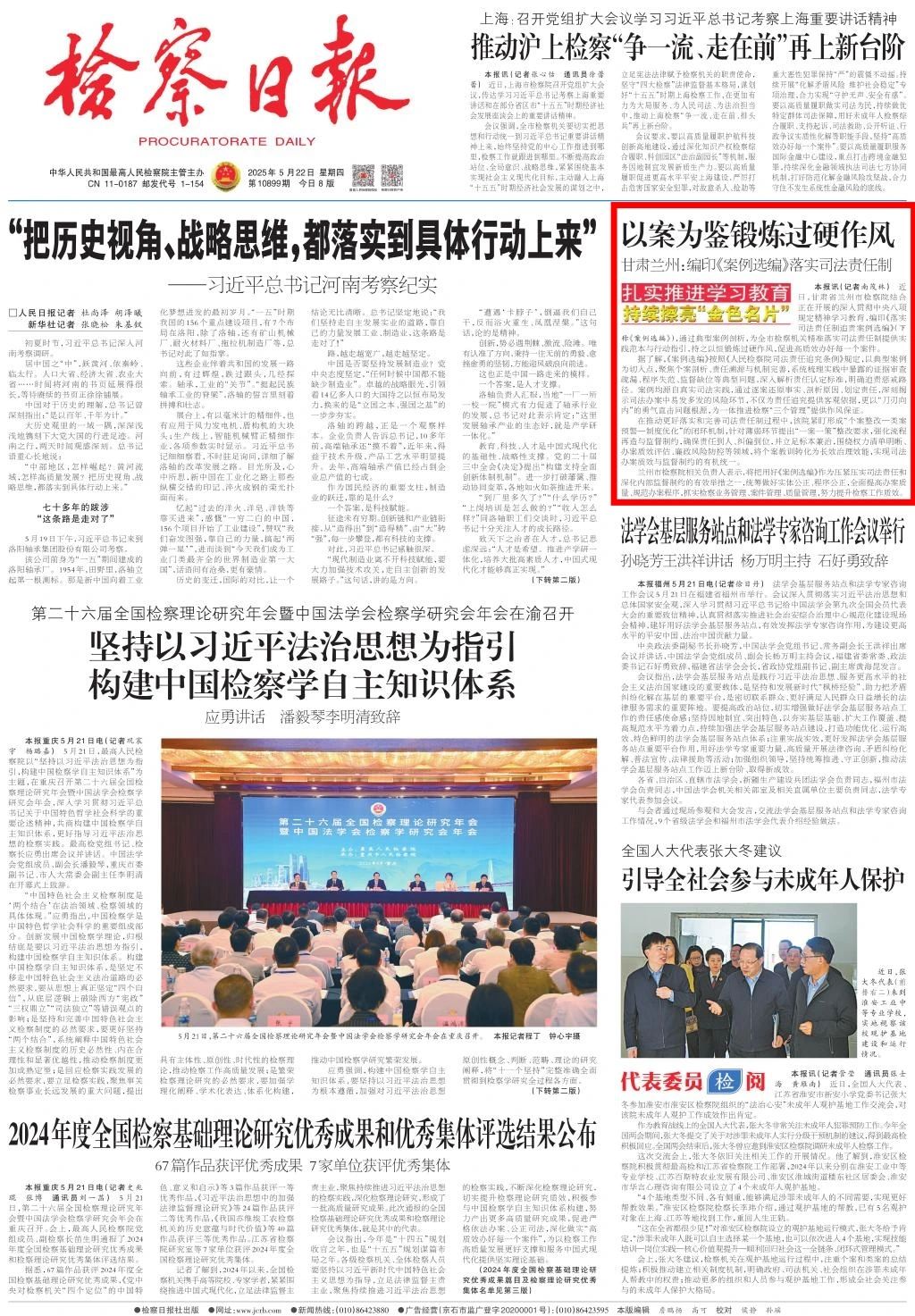 2025年5月22日,检察日报头版刊发《以案为鉴锻炼过硬作风 甘肃兰州:编印〈案例选编〉落实司法责任制》。