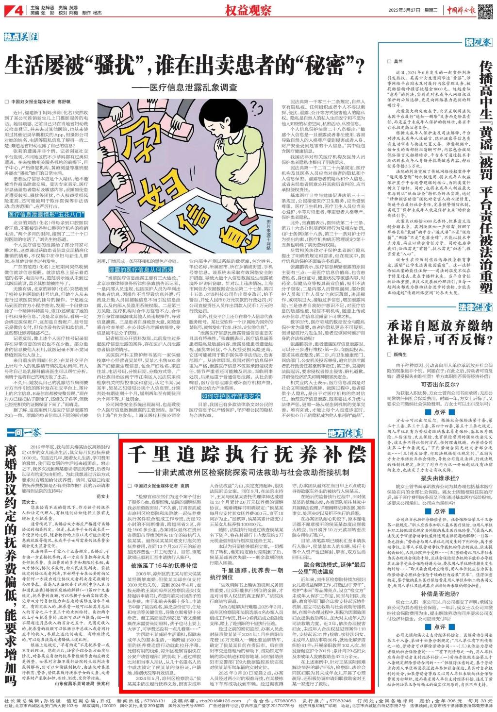2025年5月27日,中国妇女报刊发《千里追踪执行抚养补偿——甘肃武威凉州区检察院探索司法救助与社会救助衔接机制》。