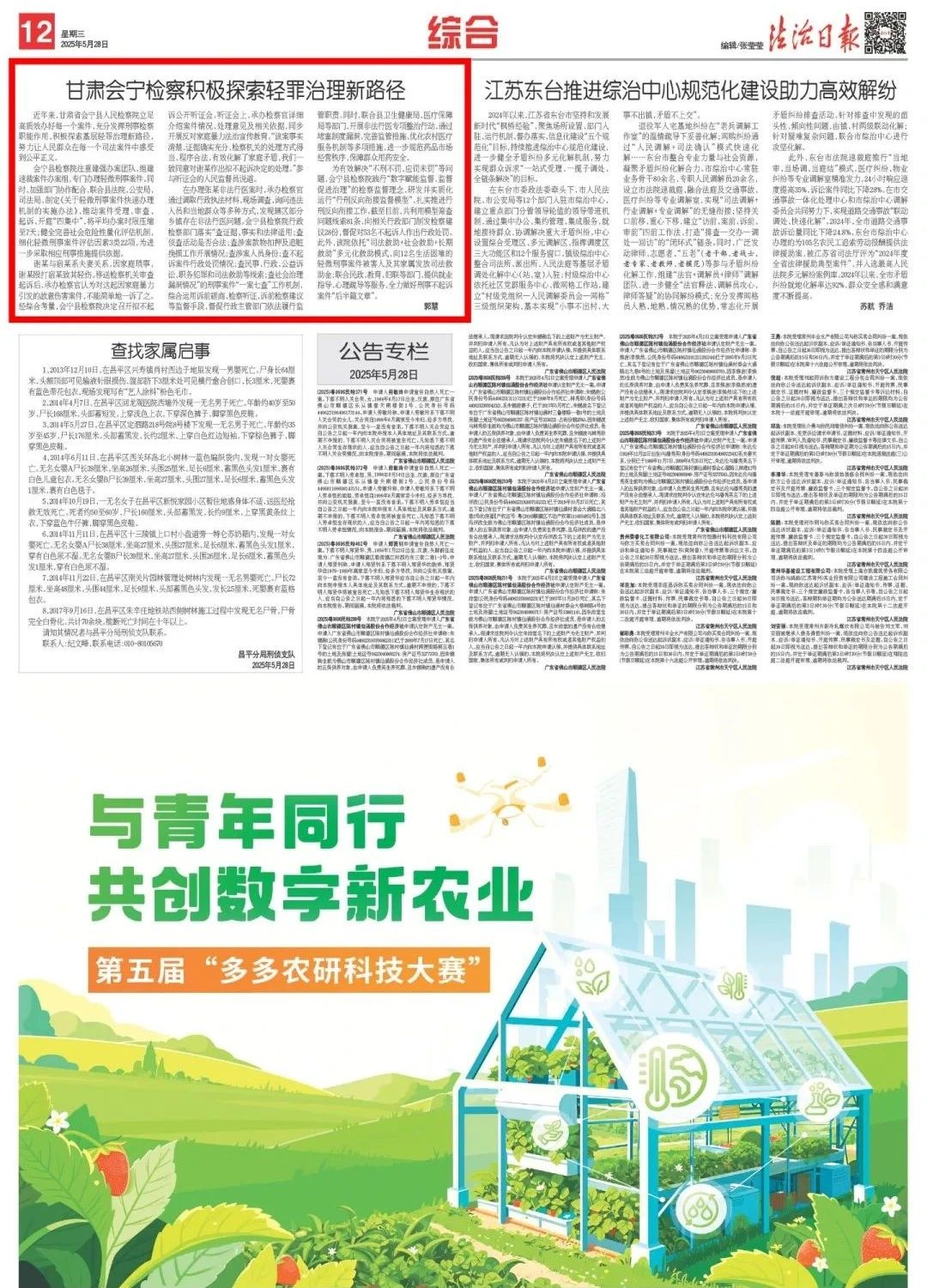 2025年5月28日,法治日报刊发《甘肃会宁检察积极探索轻罪治理新路径 》。