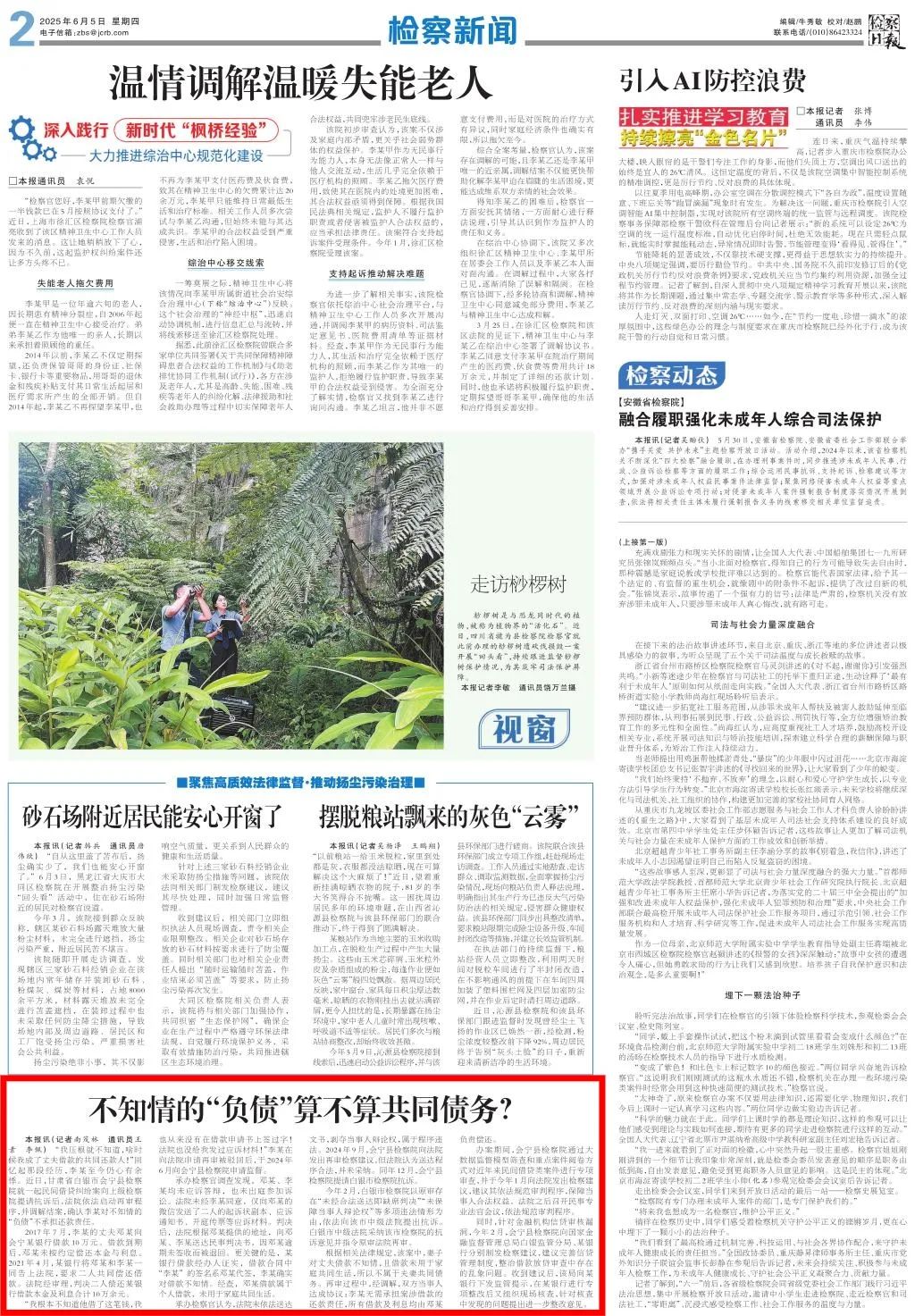2025年6月5日,检察日报刊发《不知情的“负债”算不算共同债务?》。
