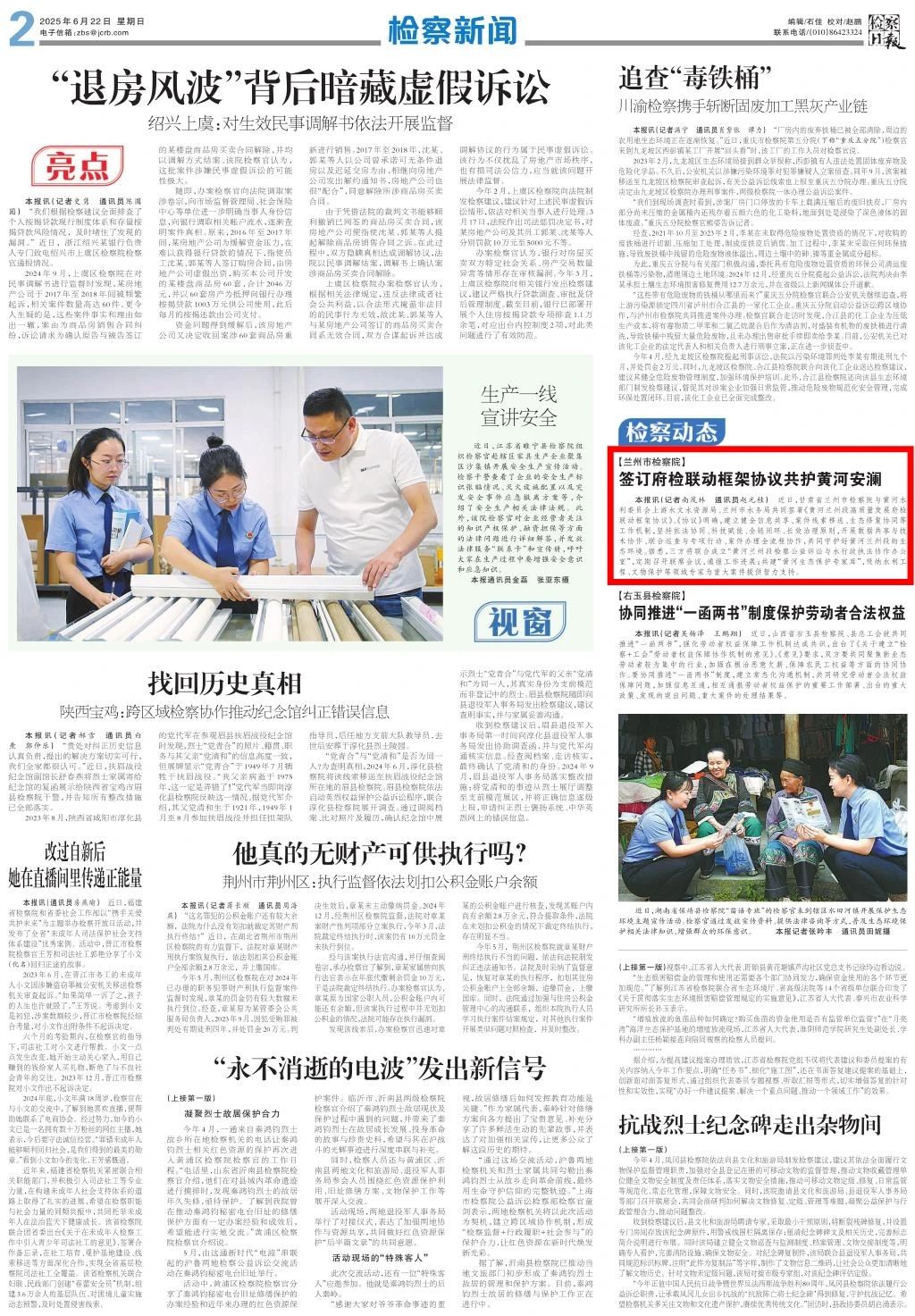 2025年6月22日,检察日报刊发《兰州市检察院:签订府检联动框架协议共护黄河安澜》。
