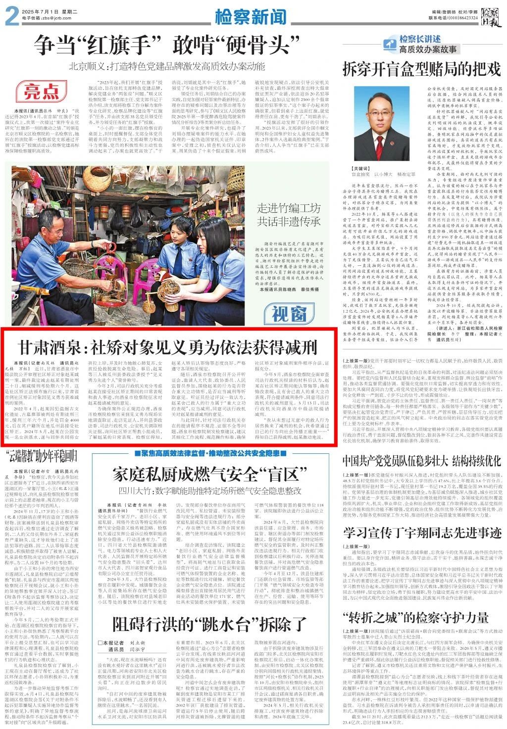 2025年7月1日,检察日报刊发《甘肃酒泉:社矫对象见义勇为依法获得减刑》。