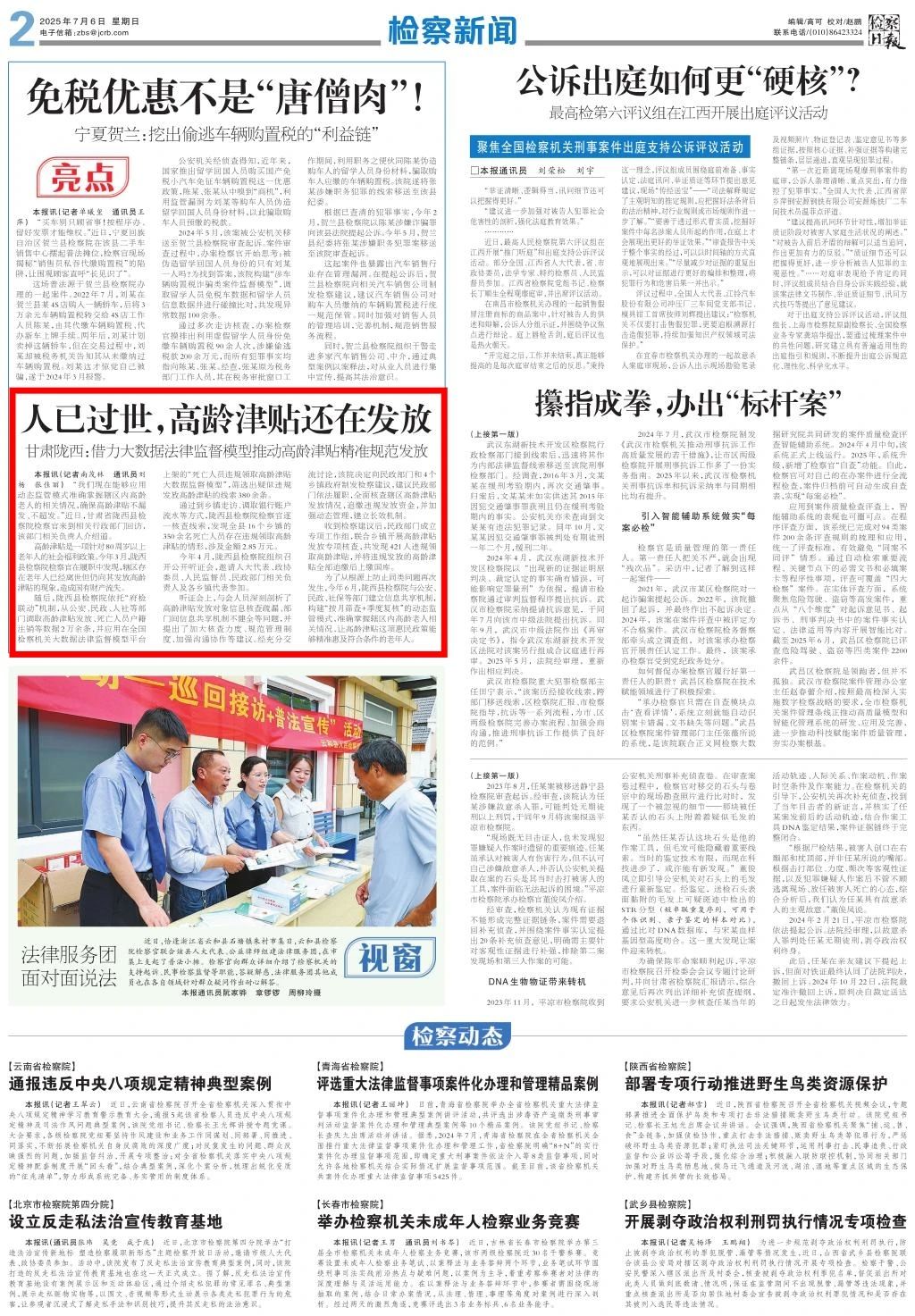 2025年7月6日,检察日报刊发《人已过世,高龄津贴还在发放——甘肃陇西:借力大数据法律监督模型推动高龄津贴精准规范发放》。