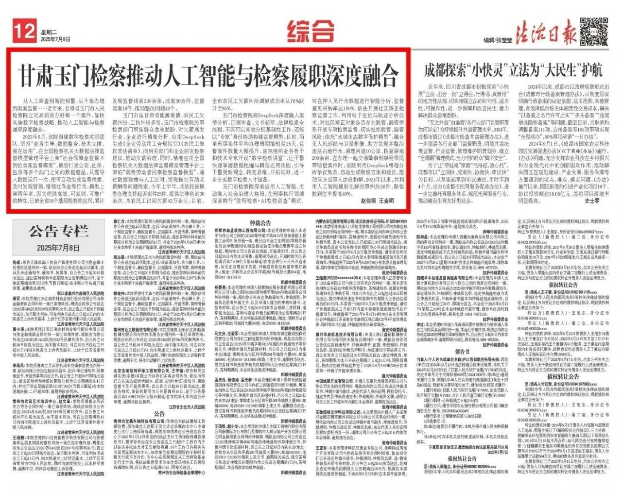 2025年7月8日,法治日报刊发《甘肃玉门检察推动人工智能与检察履职深度融合》。