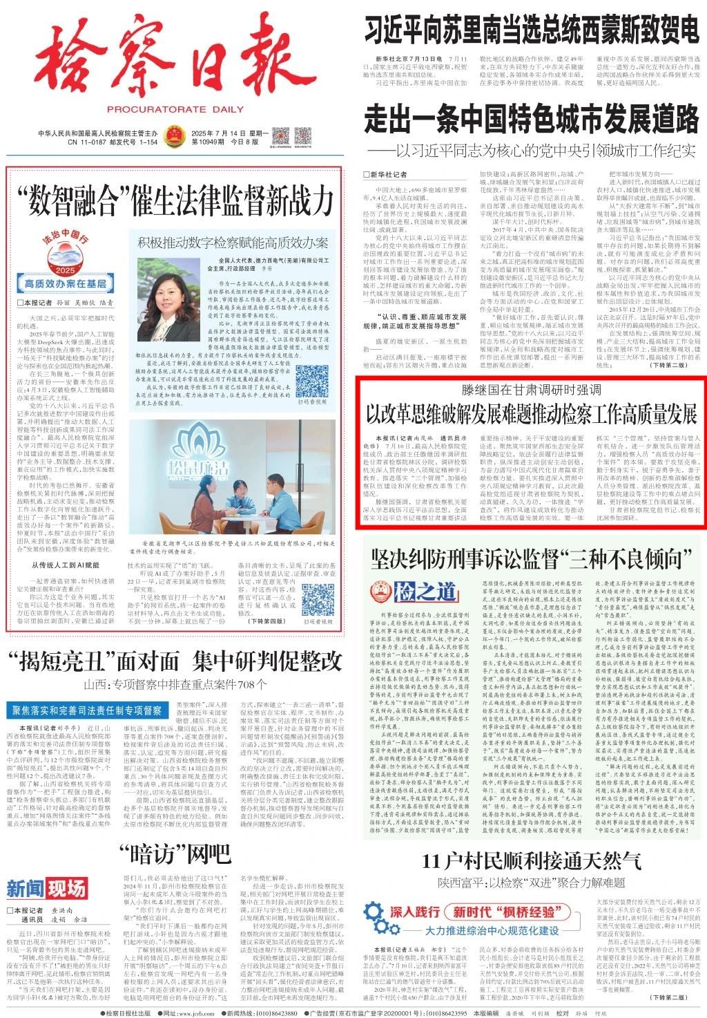 2025年7月14日,检察日报头版刊发《滕继国在甘肃调研时强调 以改革思维破解发展难题推动检察工作高质量发展》。