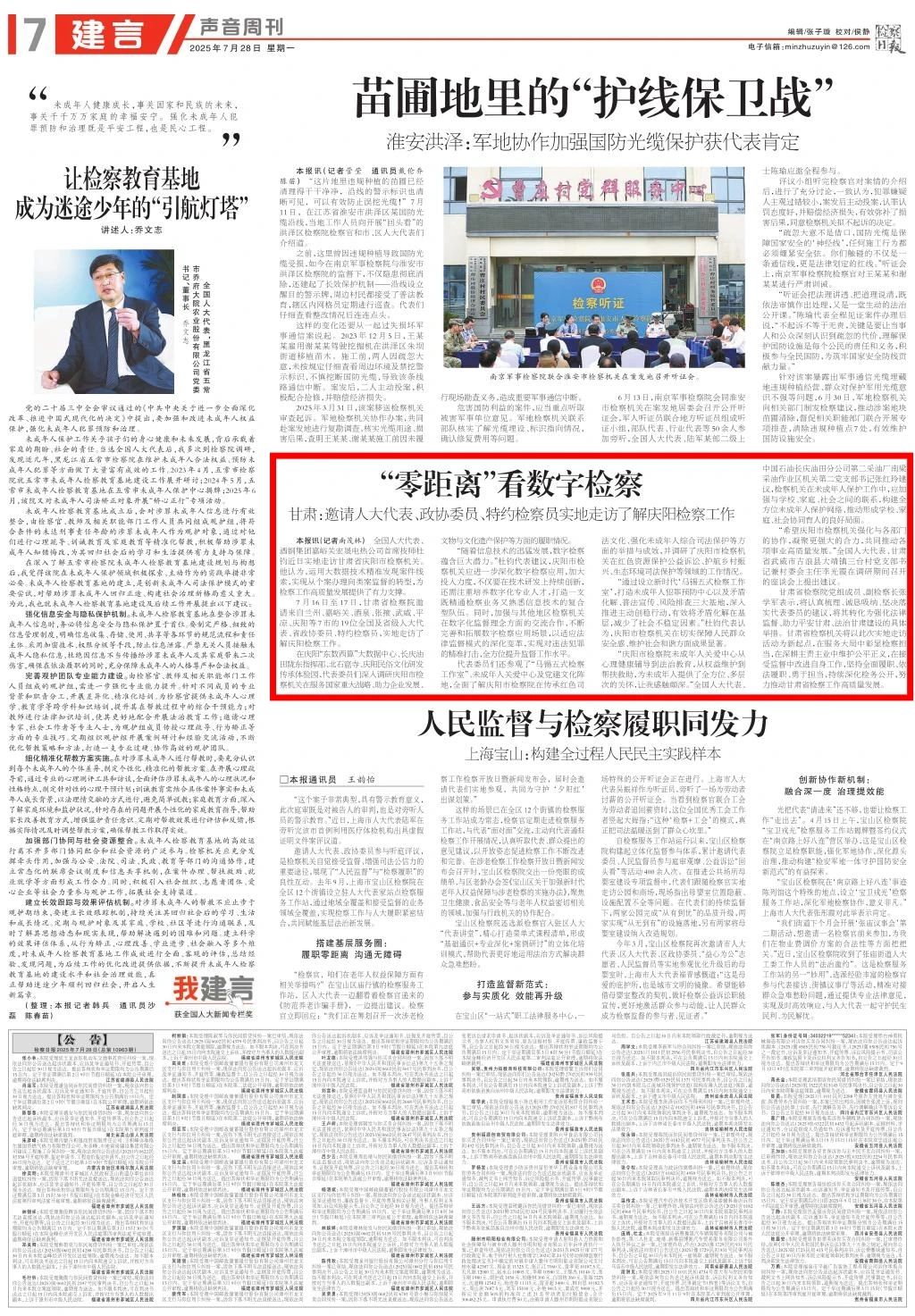 2025年7月28日,检察日报声音周刊刊发《“零距离”看数字检察 甘肃:邀请人大代表、政协委员、特约检察员实地走访了解庆阳检察工作》。