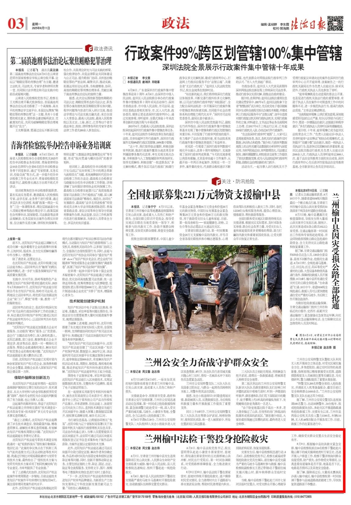 2025年8月11日,法治日报刊发《兰州榆中法检干警投身抢险救灾》。