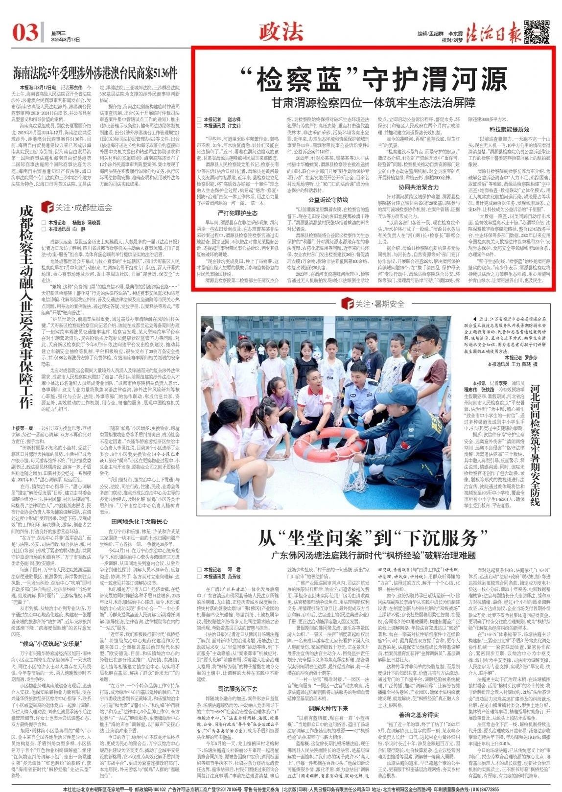 2025年8月13日,法治日报刊发《“检察蓝”守护渭河源 甘肃渭源检察四位一体筑牢生态法治屏障》。
