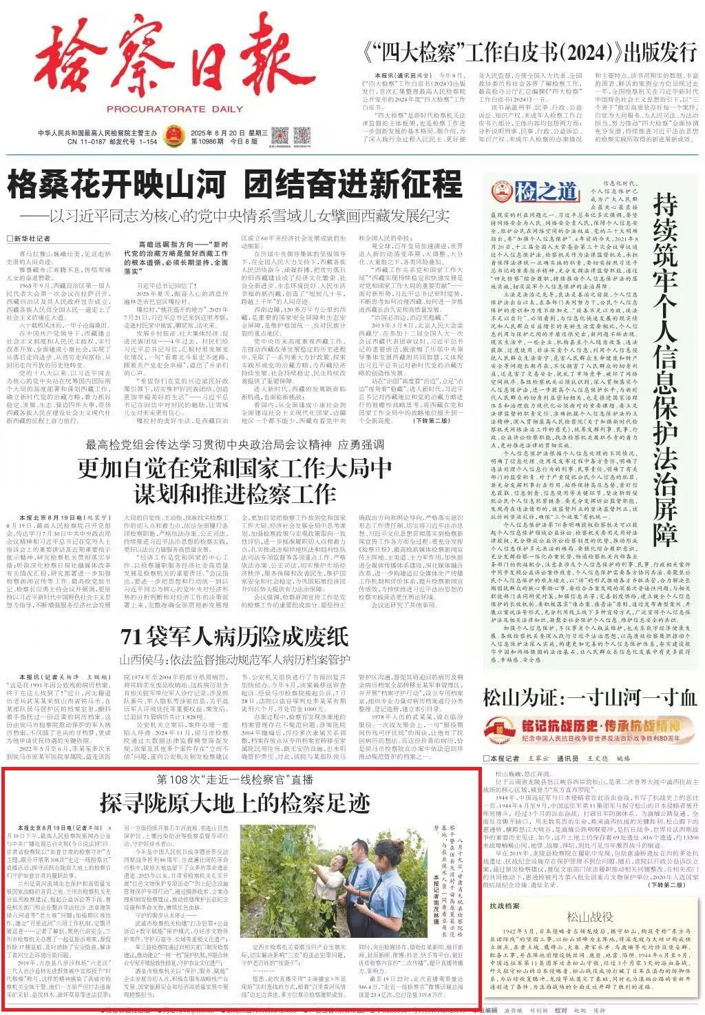 2025年8月20日,检察日报头版刊发《第108次“走近一线检察官”直播 探寻陇原大地上的检察足迹》。
