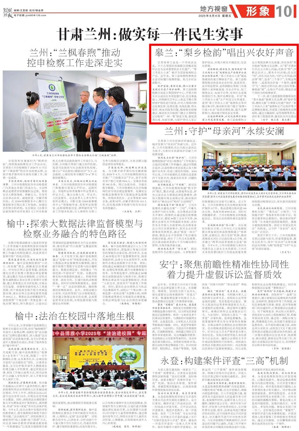 2025年8月8日,检察日报地方视窗《甘肃兰州:做实每一件民生实事》专版刊发《皋兰:“梨乡检韵”唱出兴农好声音》。