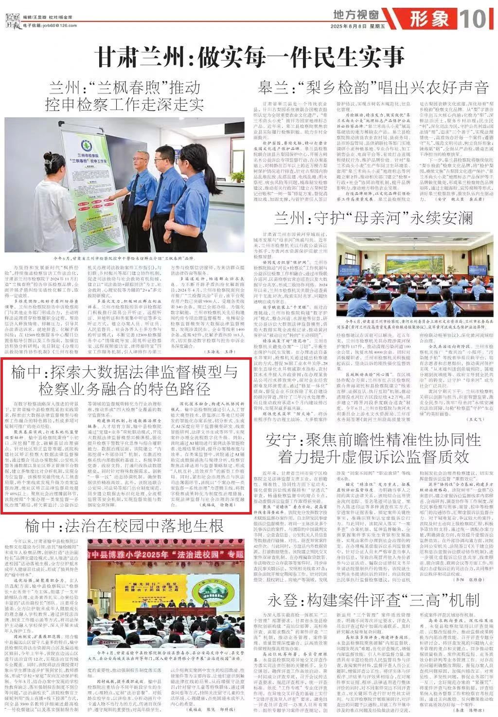 2025年8月8日,检察日报地方视窗《甘肃兰州:做实每一件民生实事》专版刊发《榆中:探索大数据法律监督模型与检察业务融合的特色路径》。
