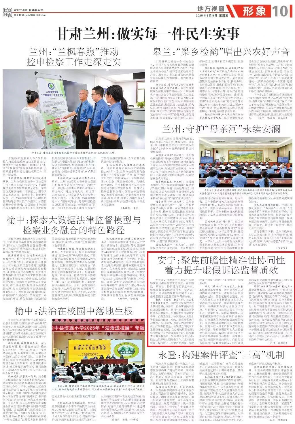 2025年8月8日,检察日报地方视窗《甘肃兰州:做实每一件民生实事》专版刊发《安宁:聚焦前瞻性精准性协同性 着力提升虚假诉讼监督质效》。