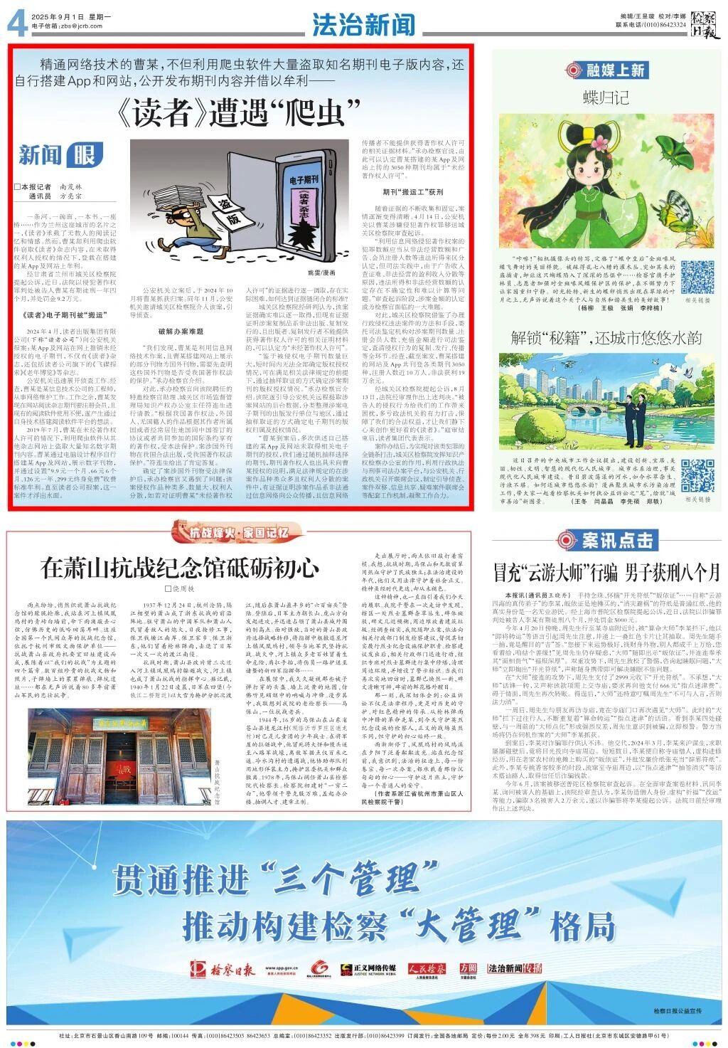 2025年9月1日,检察日报刊发《〈读者〉遭遇“爬虫”》。