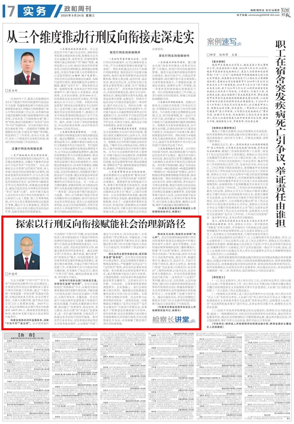 2025年9月24日,检察日报政和周刊刊发《探索以行刑反向衔接赋能社会治理新路径》。