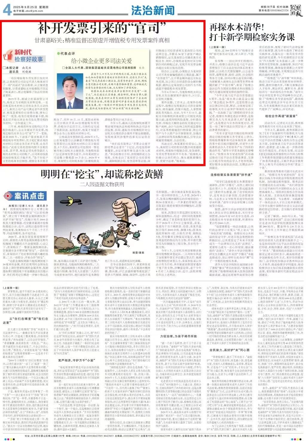 2025年9月25日,检察日报刊发《补开发票引来的“官司” 甘肃嘉峪关:精准监督还原虚开增值税专用发票案件真相》。