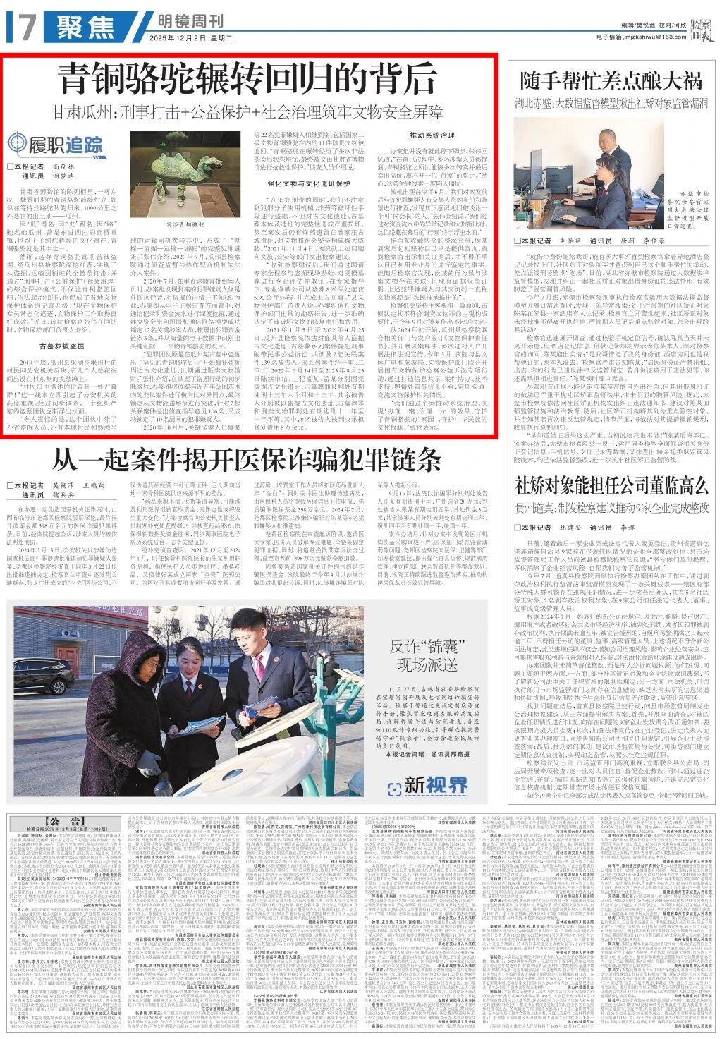 2025年12月2日,检察日报明镜周刊刊发《青铜骆驼辗转回归的背后 甘肃瓜州:刑事打击+公益保护+社会治理筑牢文物安全屏障》。