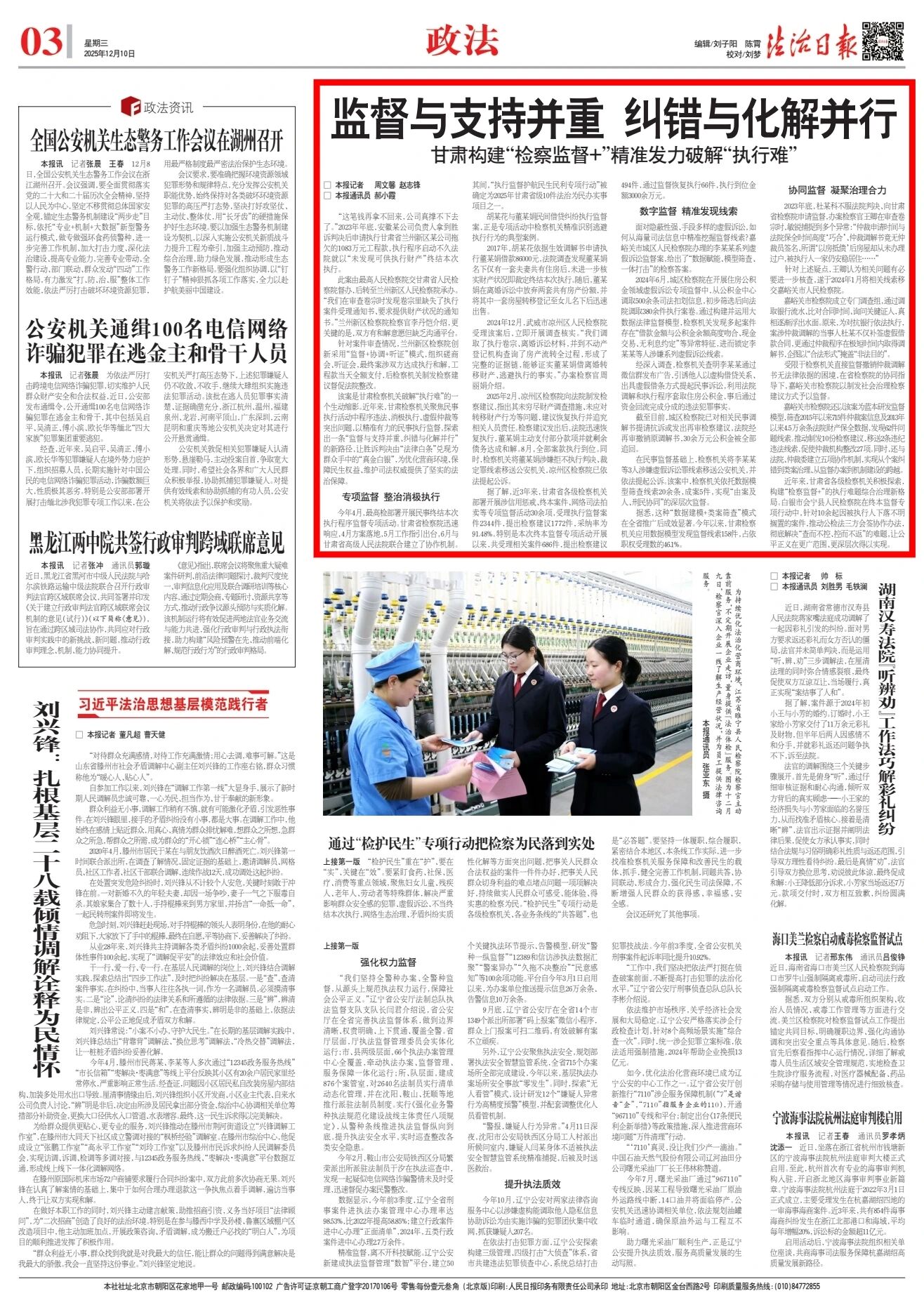 2025年12月10日,法治日报刊发《监督与支持并重 纠错与化解并行 甘肃构建“检察监督+”精准发力破解“执行难”》。