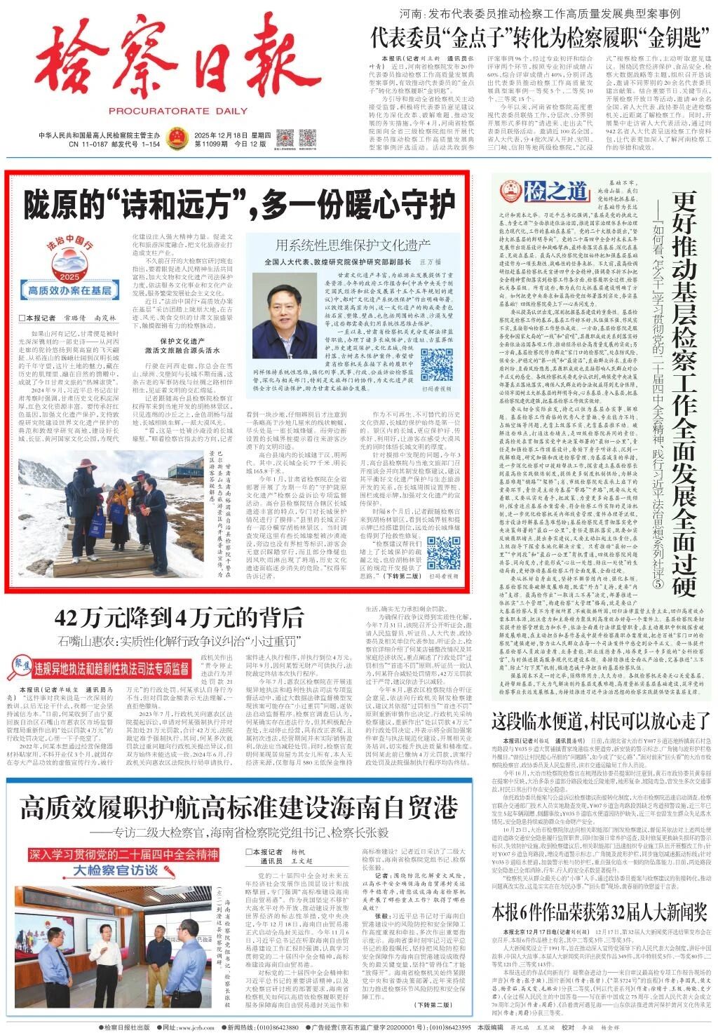 2025年12月18日,检察日报头版头条刊发《陇原的“诗和远方”,多一份暖心守护》。