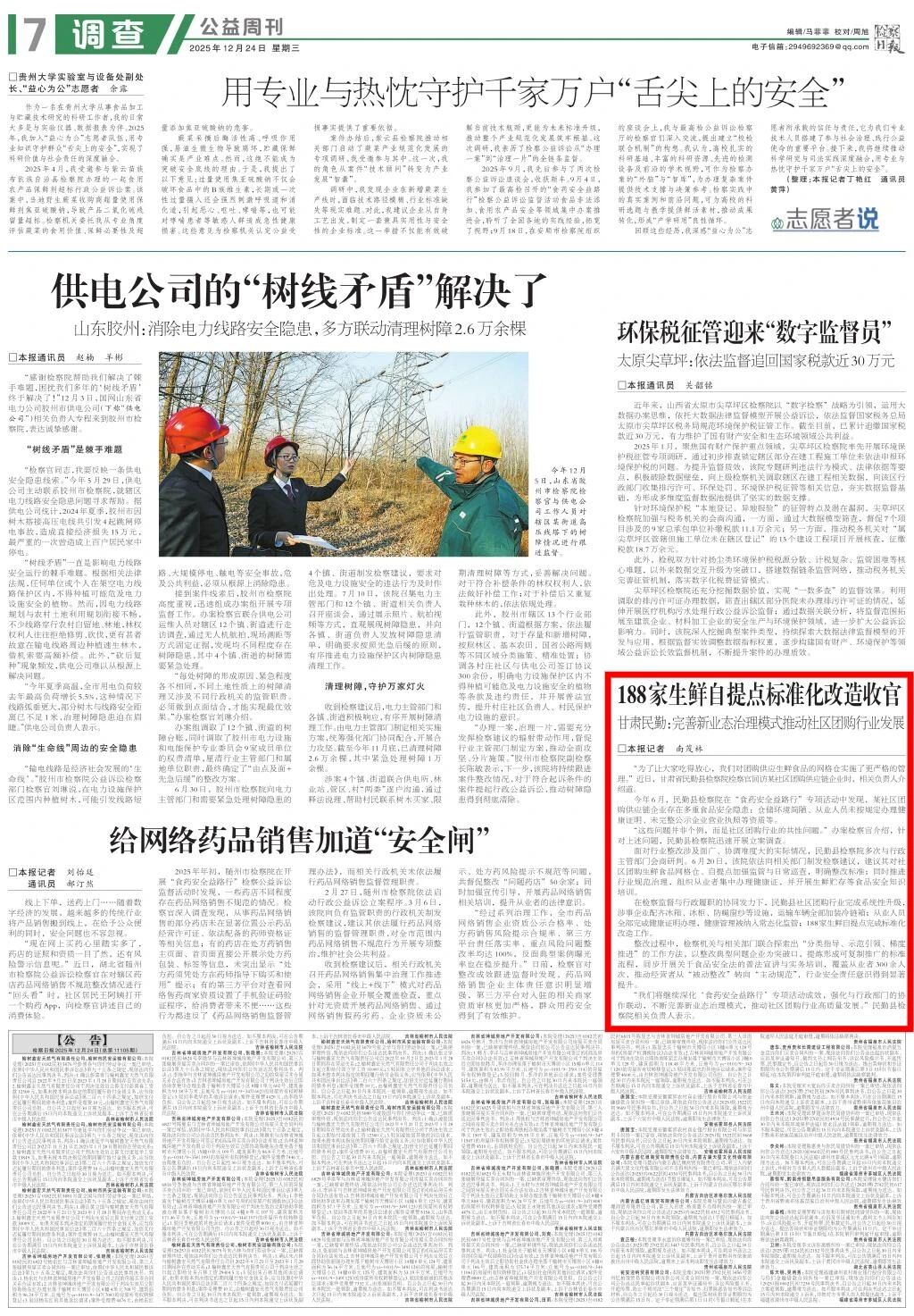 2025年12月24日,检察日报公益周刊刊发《188家生鲜自提点标准化改造收官 甘肃民勤:完善新业态治理模式推动社区团购行业发展》。