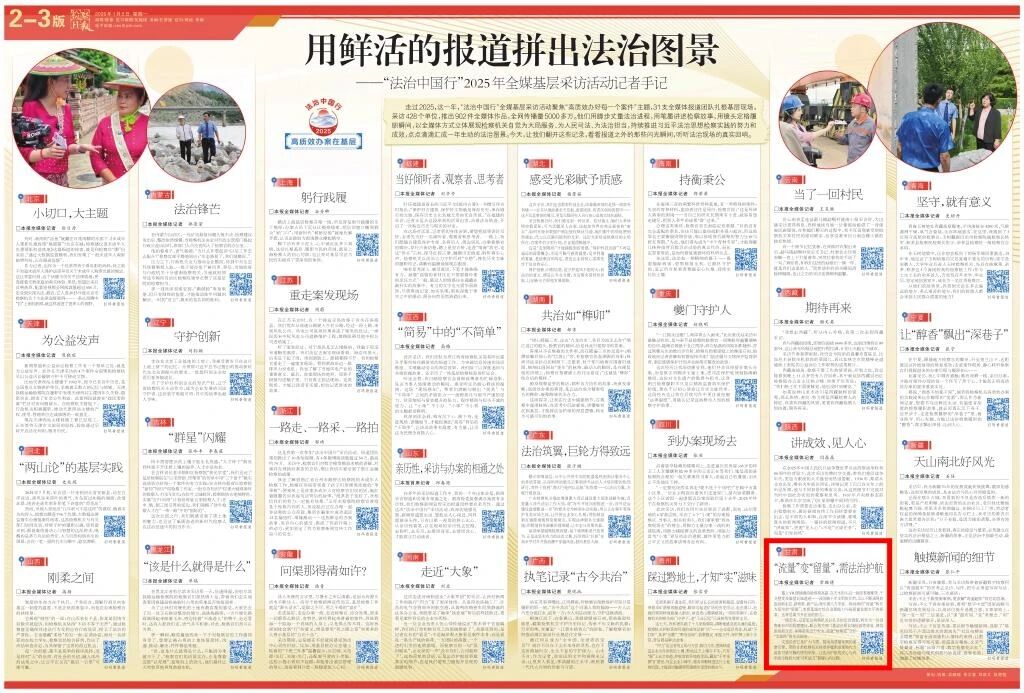 2026年1月5日,检察日报《用鲜活的报道拼出法治图景 ——“法治中国行”2025年全媒基层采访活动记者手记》专版刊发《甘肃:“流量”变“留量”,需法治护航》。
