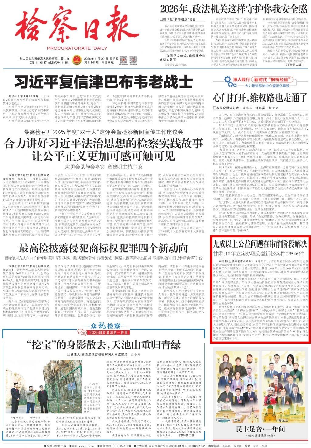 2026年1月29日,检察日报头版刊发《九成以上公益问题在审前阶段解决 甘肃:10年立案办理公益诉讼案件29546件》。