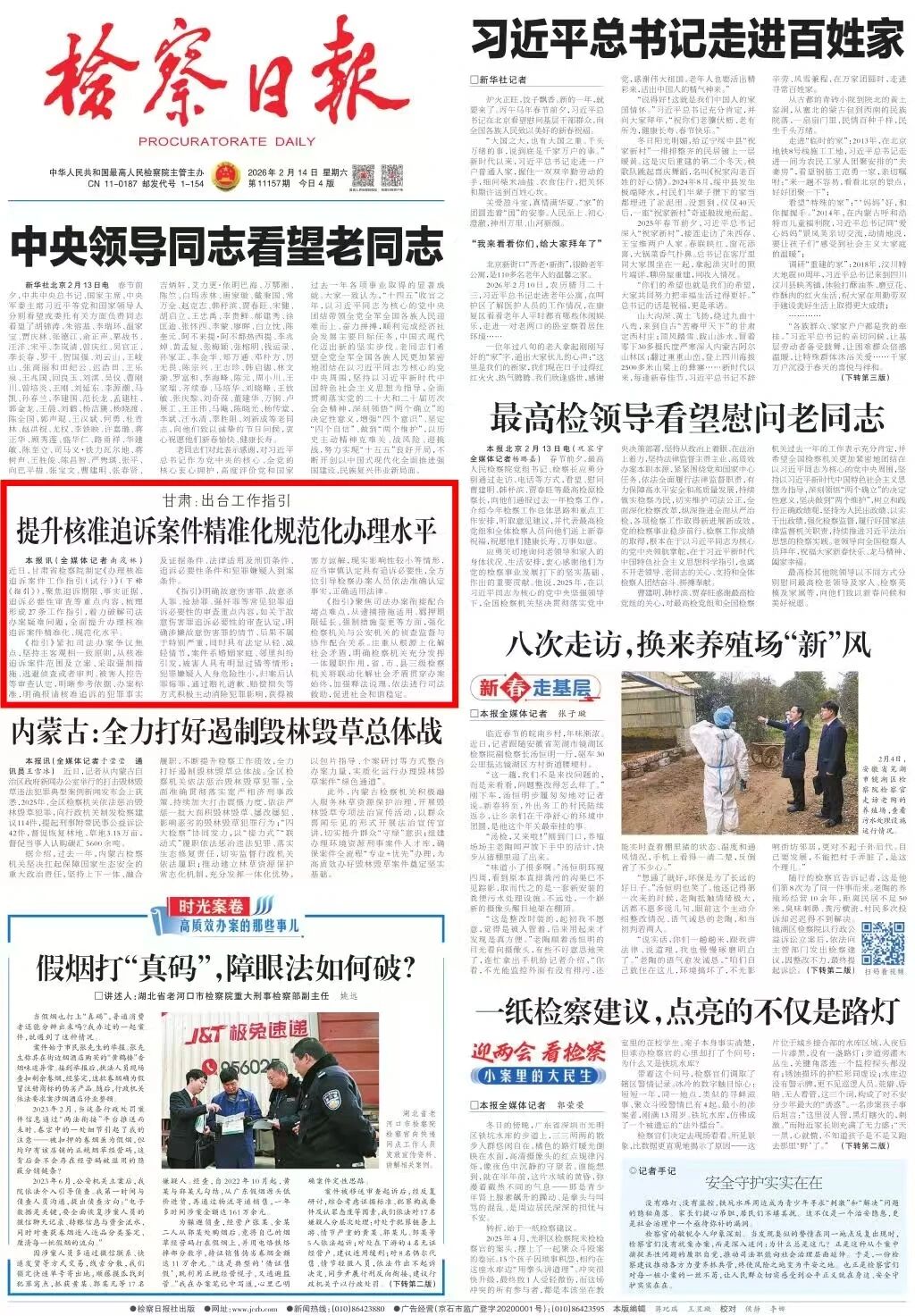 2026年2月14日,检察日报头版刊发《甘肃:出台工作指引 提升核准追诉案件精准化规范化办理水平》。