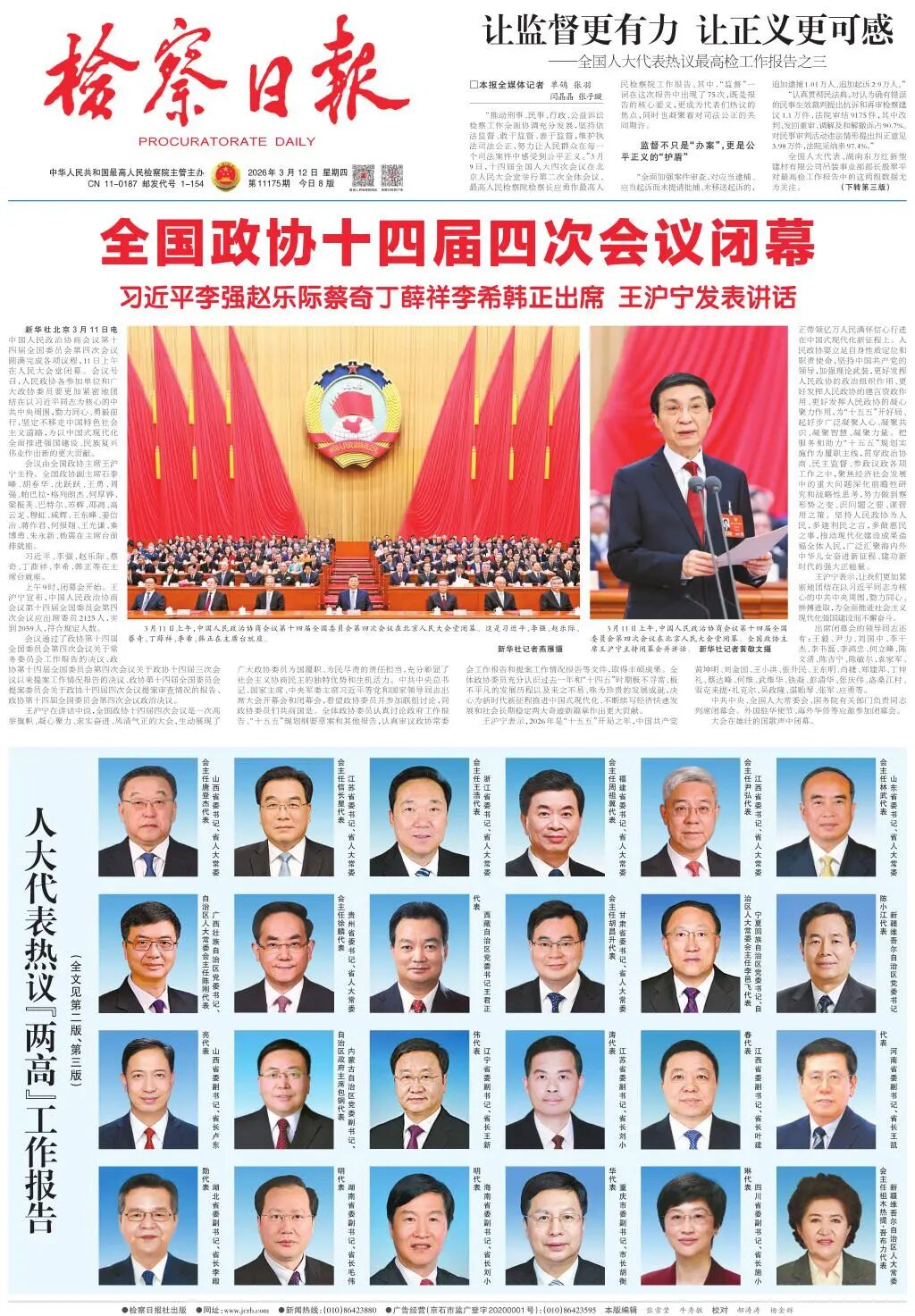 2026年3月12日,检察日报头版《人大代表热议“两高”工作报告》刊发《甘肃省委书记、省人大常委会主任胡昌升代表:有政治高度有法治力度有民生温度》。