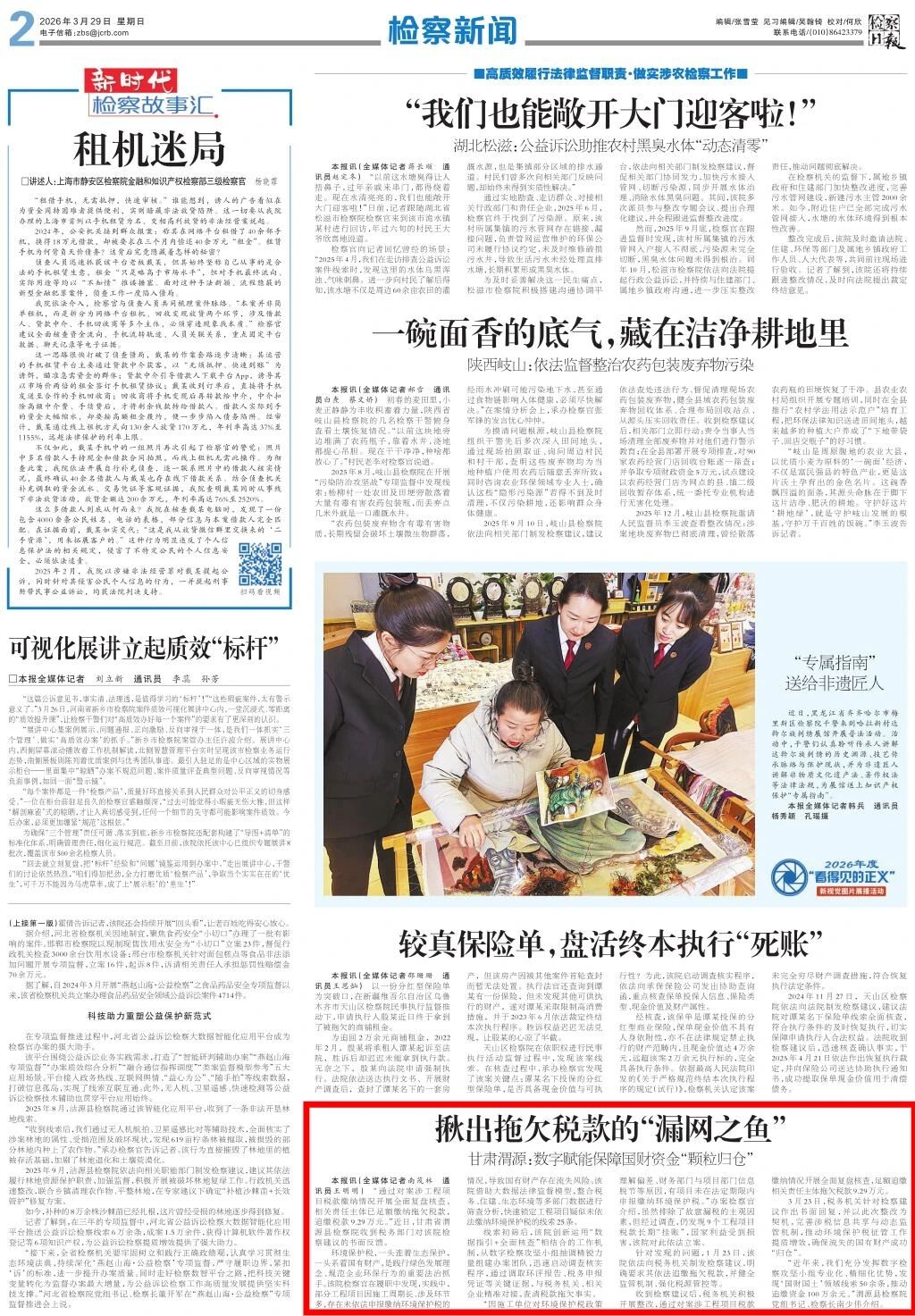 2026年3月29日,检察日报刊发《揪出拖欠税款的“漏网之鱼” 甘肃渭源:数字赋能保障国财资金“颗粒归仓”》。