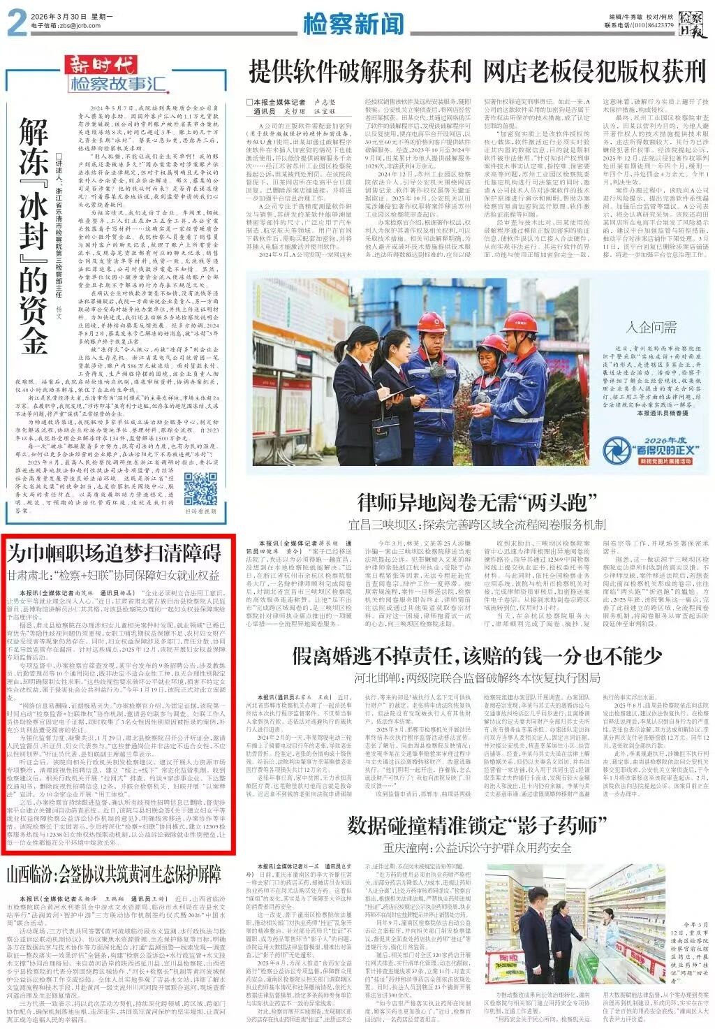 2026年3月30日,检察日报刊发《为巾帼职场追梦扫清障碍 甘肃肃北:“检察+妇联”协同保障妇女就业权益》。