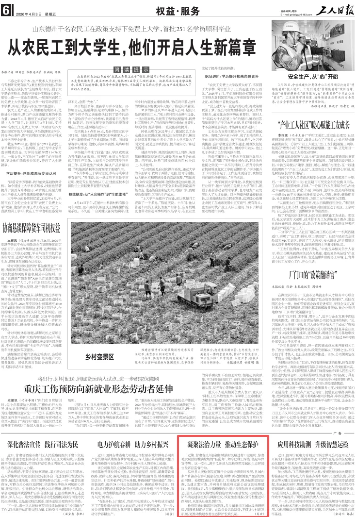 2026年4月3日,工人日报刊发《凝聚法治力量 推动生态保护》。