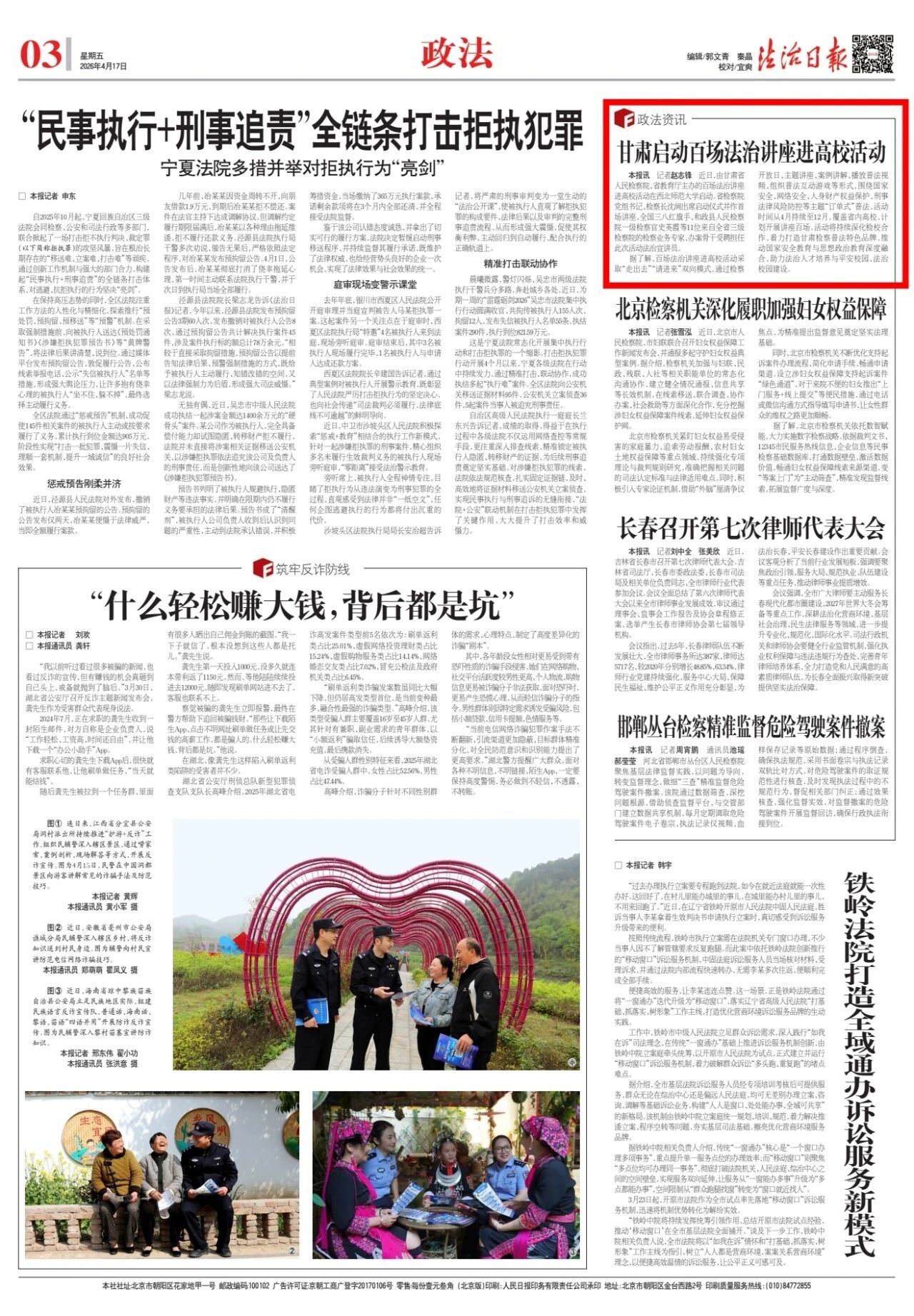2026年4月17日,法治日报刊发《甘肃启动百场法治讲座进高校活动》。