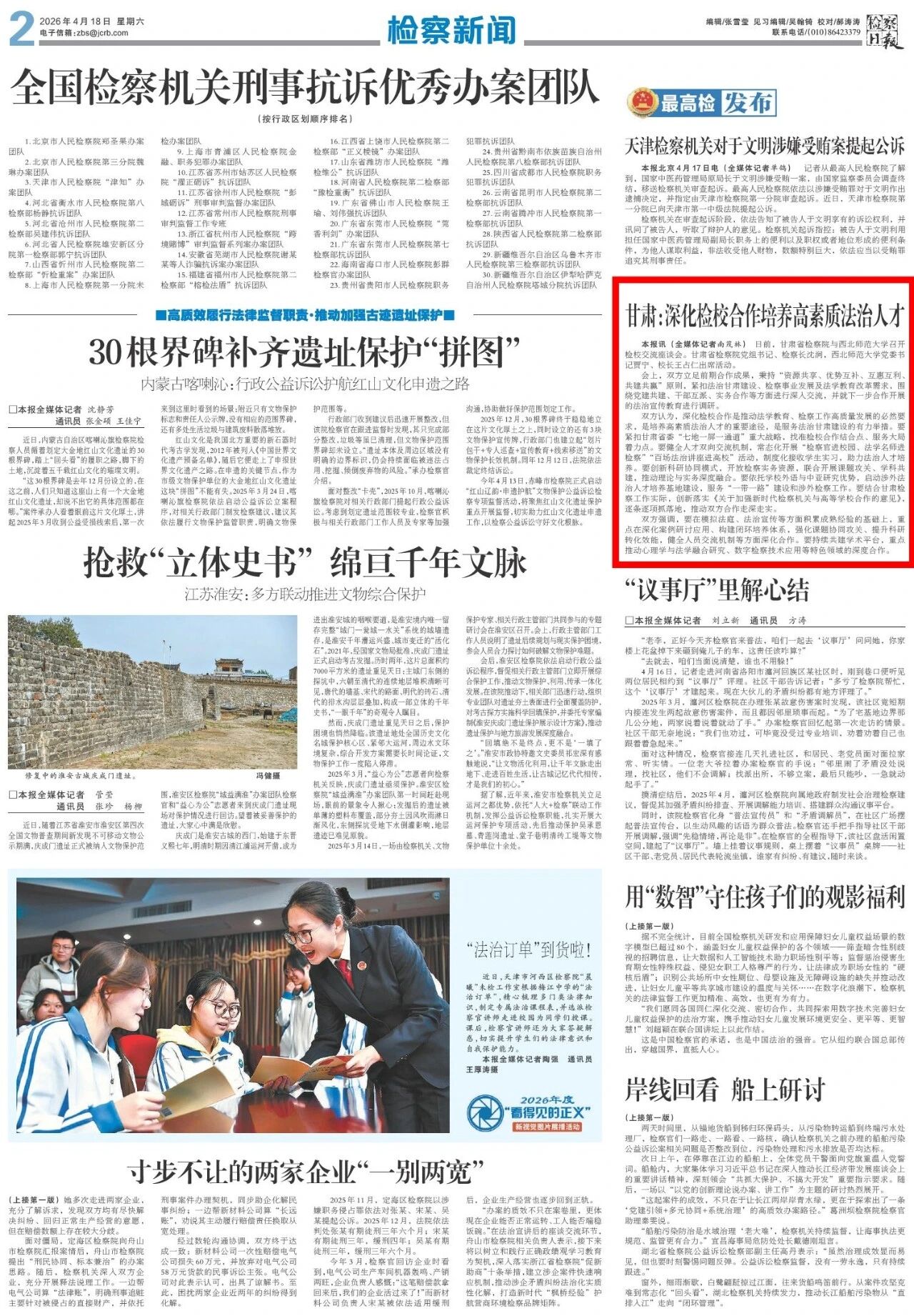 2026年4月18日,检察日报刊发《甘肃:深化检校合作培养高素质法治人才》。