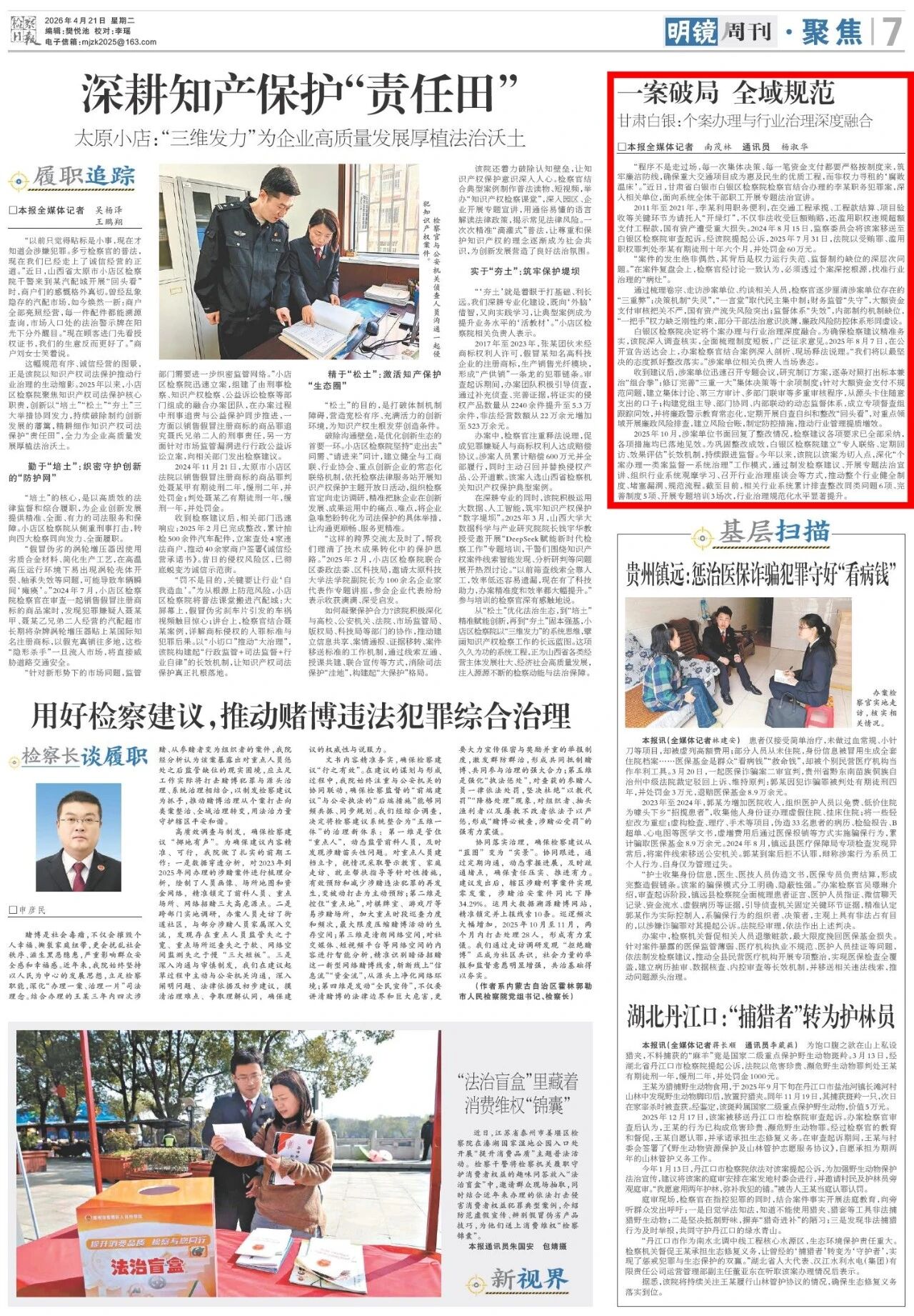 2026年4月21日,检察日报明镜周刊刊发《一案破局 全域规范 甘肃白银:个案办理与行业治理深度融合》。